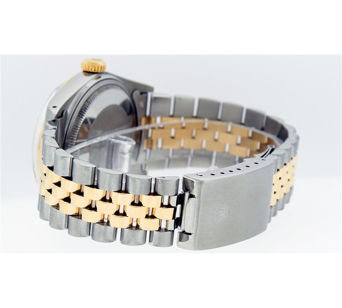 One Mens Two Tone Rolex Datejust Polished, Serviced & Electronically Tested, 14K Yellow Gold & Stainless Steel Case: 36mm,14K Yellow Gold Crown, Bezel: 14K Yellow Gold Fluted Bezel. Custom Crystal: Acrylic Cyclops Lens. Movement: Automatic Winding Movement Caliber 3035. Dial: Champagne Tapestry Dial With Index Hour Markers and Small Track. Date Window: 3 O'Clock Position Date Display, Quickset, Model: 16013 Condition: G-6 Extra Fine. Bracelet: Two Tone 14K Yellow Gold & Stainless Steel Jubilee. Bright Polish. 7.0 Inch Length, Adjustable. Standard Clasp, With Rolex Logo. Comes with 6 month warranty.