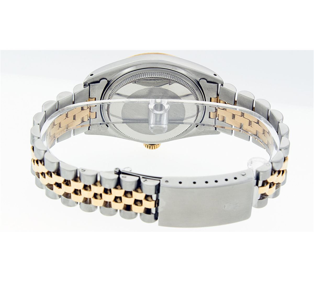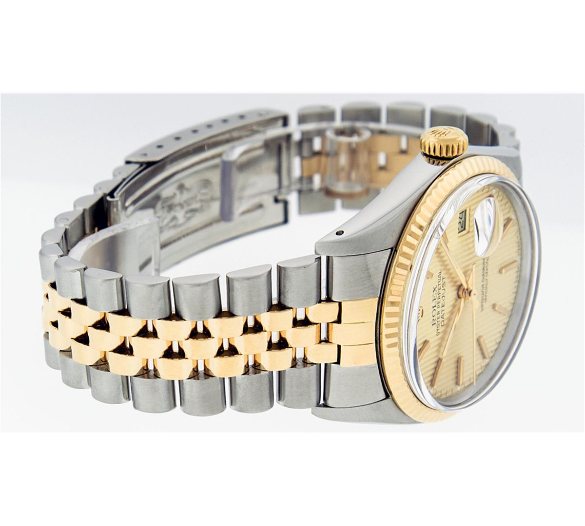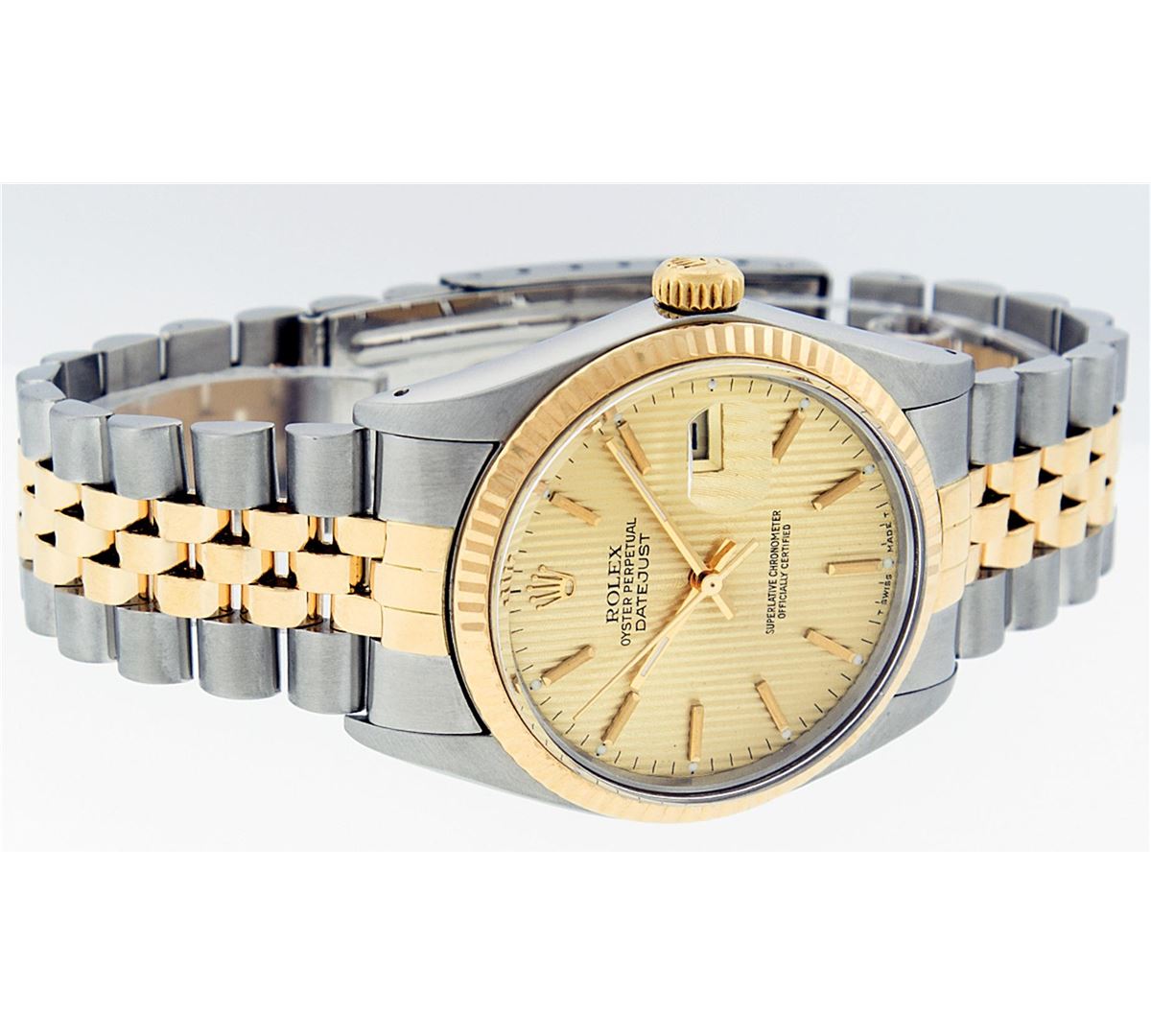 One Mens Two Tone Rolex Datejust Polished, Serviced & Electronically Tested, 14K Yellow Gold & Stainless Steel Case: 36mm,14K Yellow Gold Crown, Bezel: 14K Yellow Gold Fluted Bezel. Custom Crystal: Acrylic Cyclops Lens. Movement: Automatic Winding Movement Caliber 3035. Dial: Champagne Tapestry Dial With Index Hour Markers and Small Track. Date Window: 3 O'Clock Position Date Display, Quickset, Model: 16013 Condition: G-6 Extra Fine. Bracelet: Two Tone 14K Yellow Gold & Stainless Steel Jubilee. Bright Polish. 7.0 Inch Length, Adjustable. Standard Clasp, With Rolex Logo. Comes with 6 month warranty.