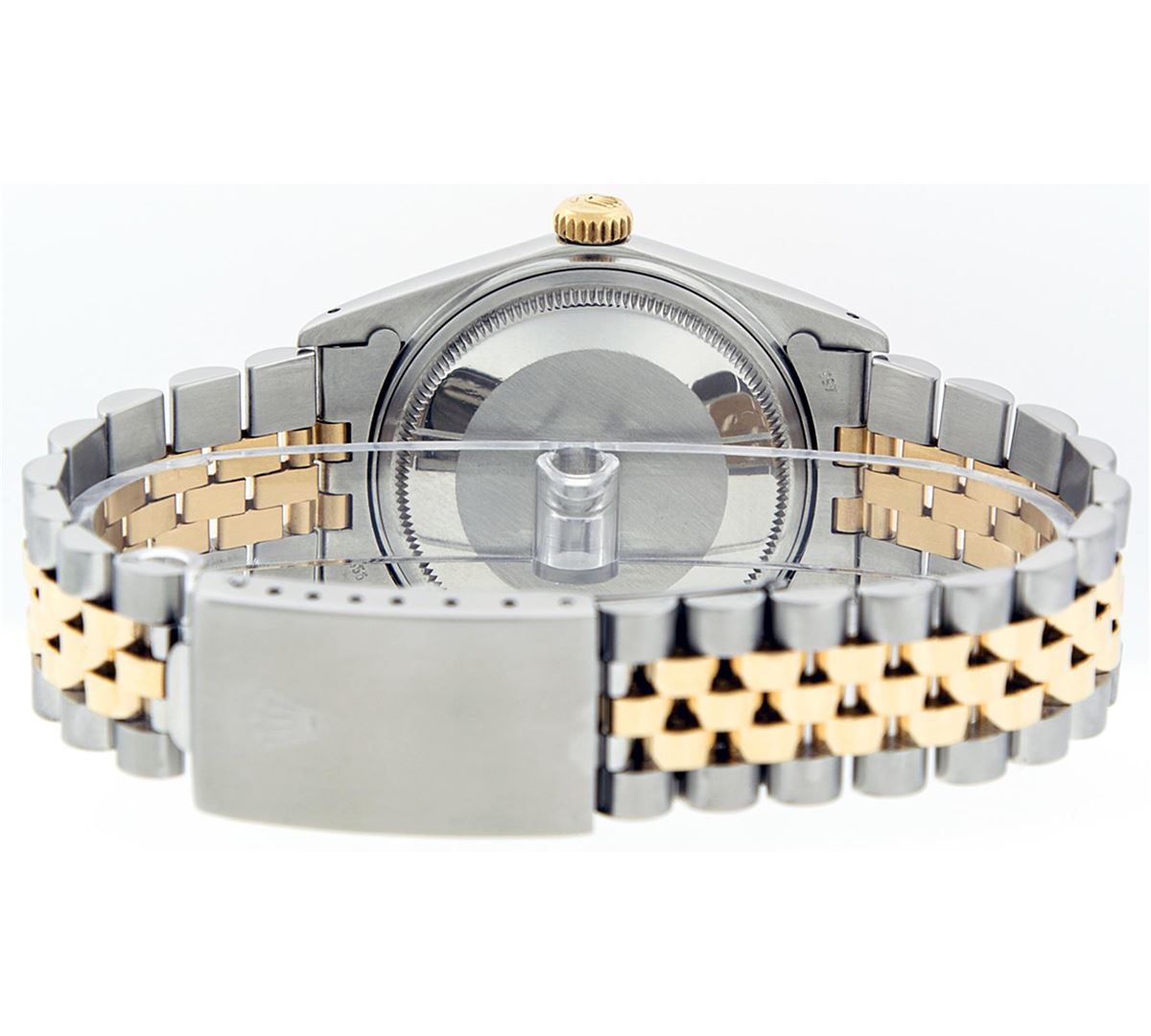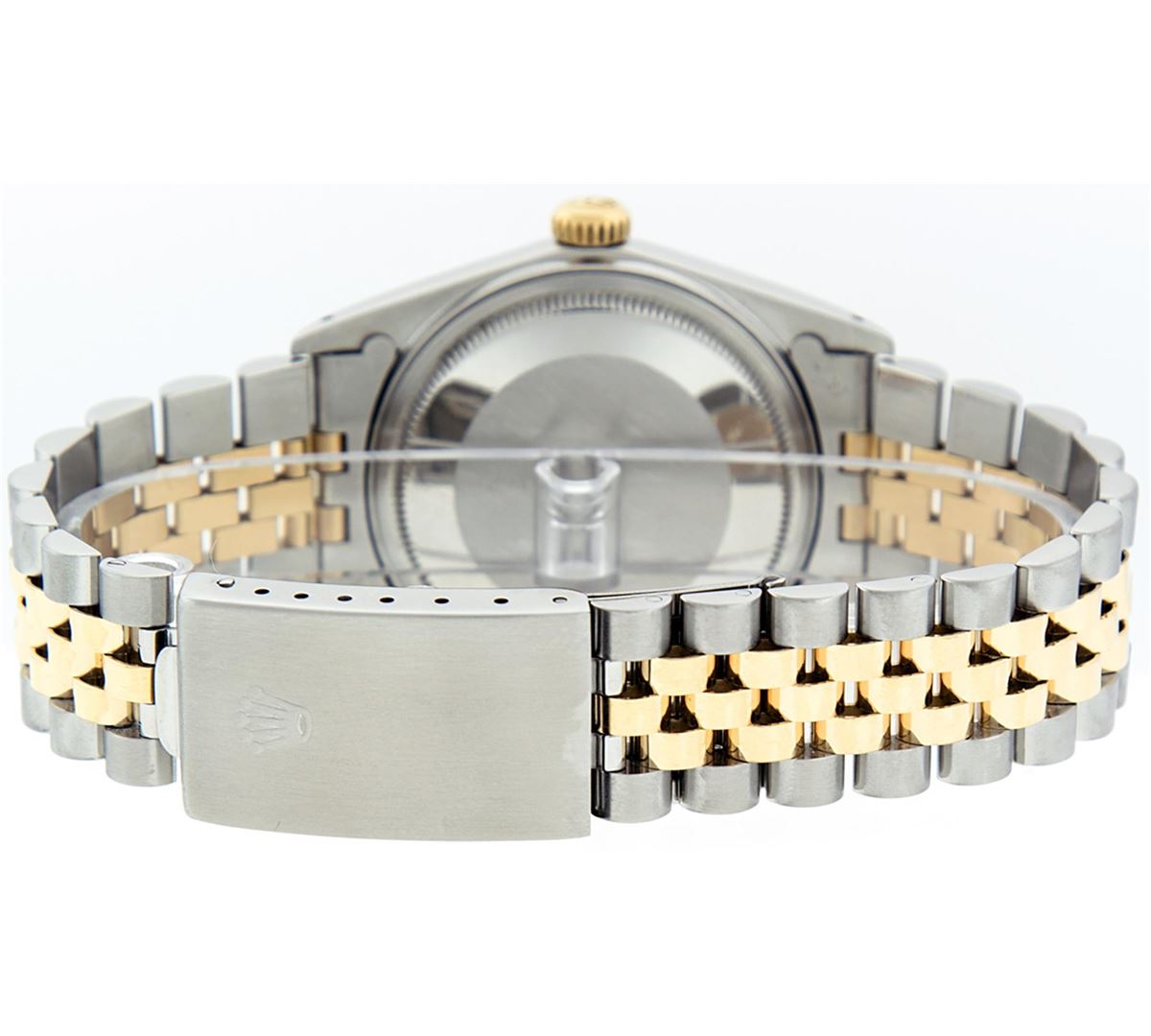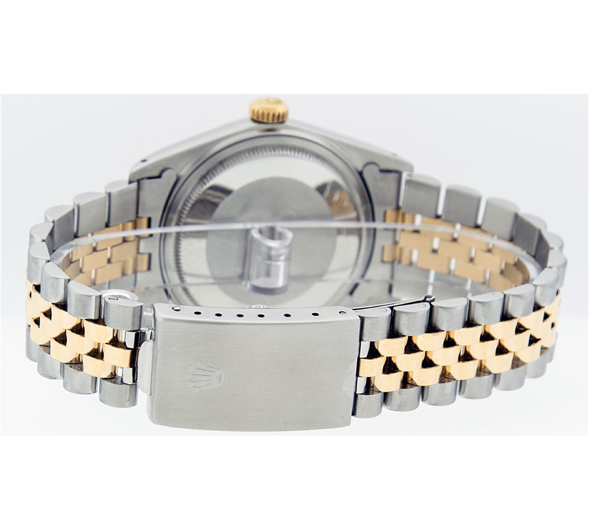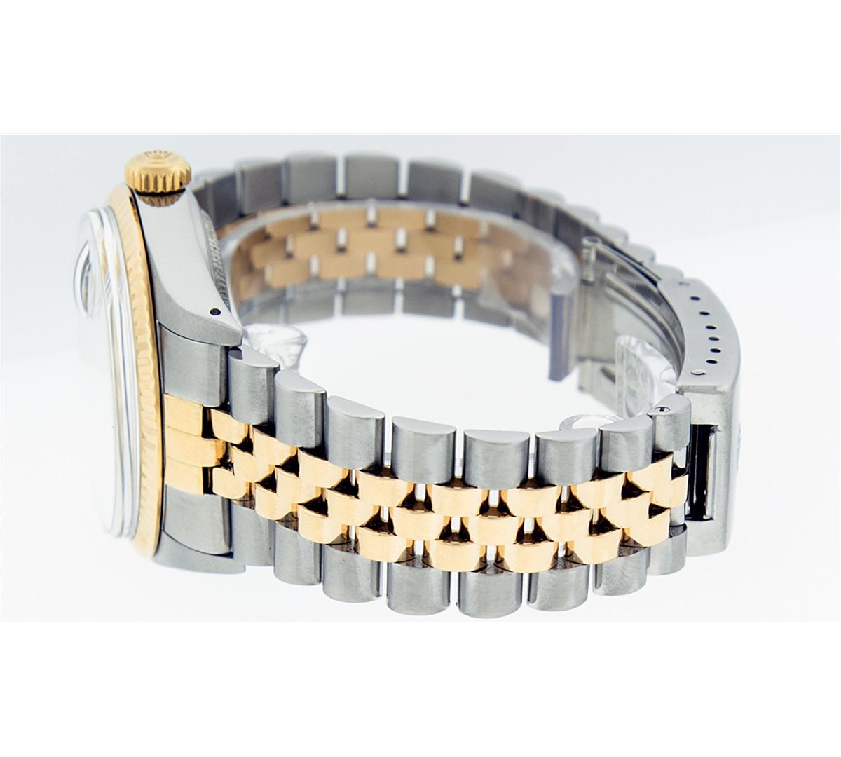 One Mens Two Tone Rolex Datejust Polished, Serviced & Electronically Tested, 14K Yellow Gold & Stainless Steel Case: 36mm,14K Yellow Gold Crown, Bezel: 14K Yellow Gold Fluted Bezel. Custom Crystal: Acrylic Cyclops Lens. Movement: Automatic Winding Movement Caliber 3035. Dial: Champagne Tapestry Dial With Index Hour Markers and Small Track. Date Window: 3 O'Clock Position Date Display, Quickset, Model: 16013 Condition: G-6 Extra Fine. Bracelet: Two Tone 14K Yellow Gold & Stainless Steel Jubilee. Bright Polish. 7.0 Inch Length, Adjustable. Standard Clasp, With Rolex Logo. Comes with 6 month warranty.