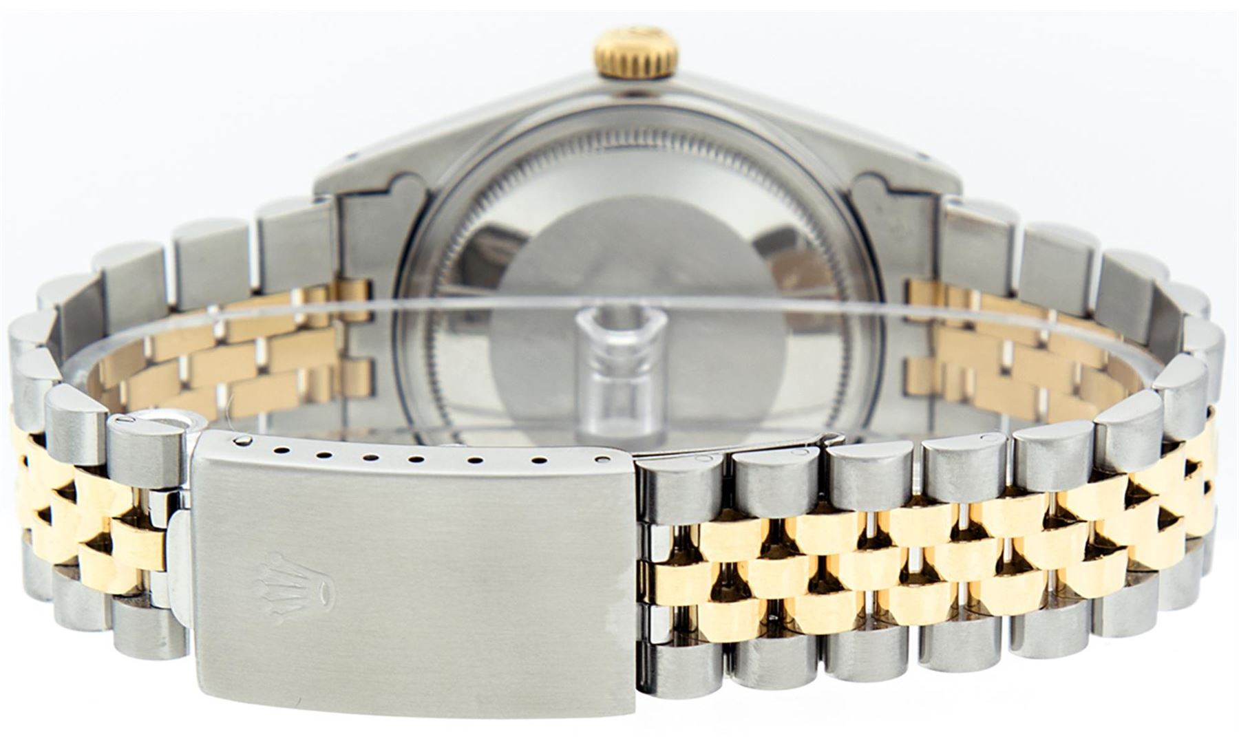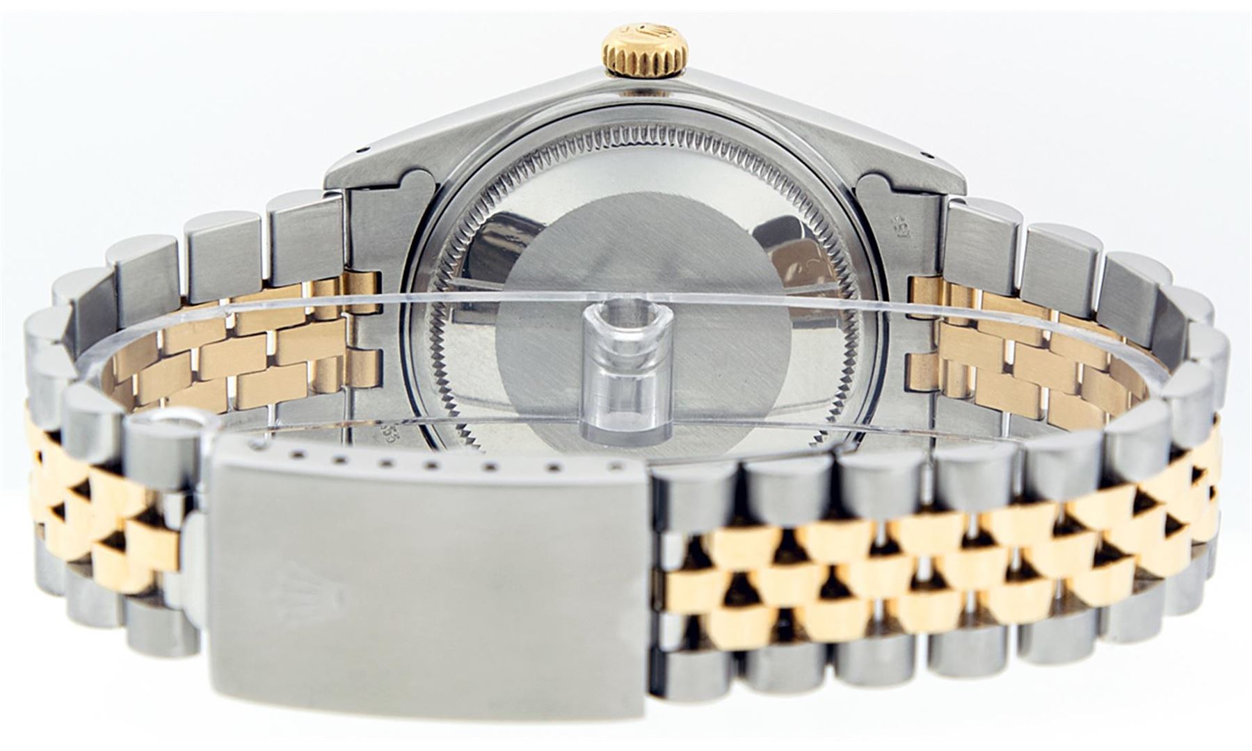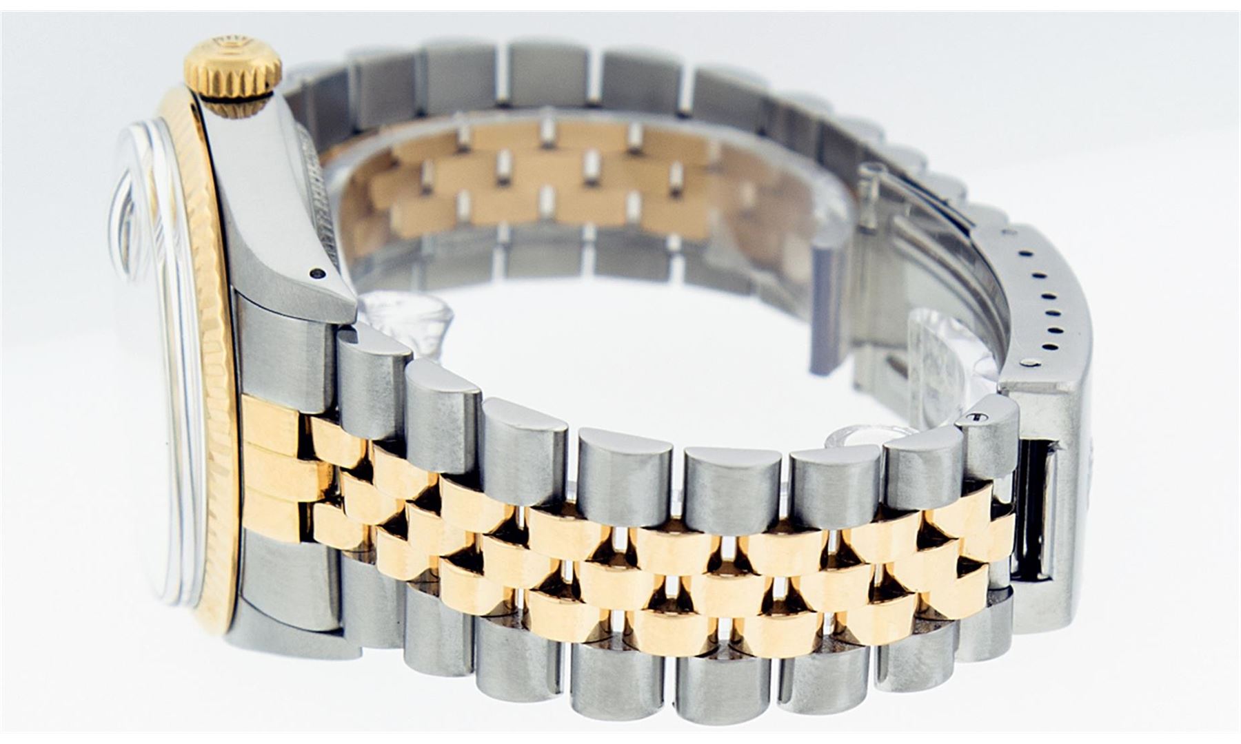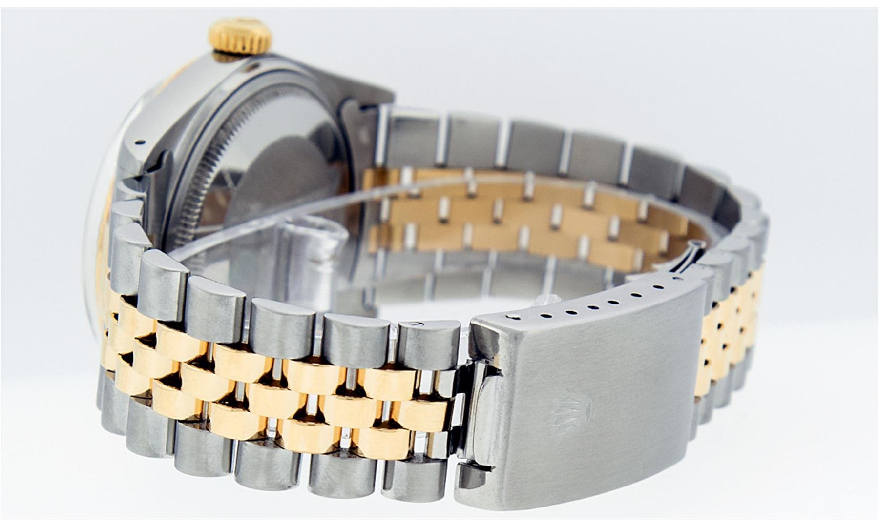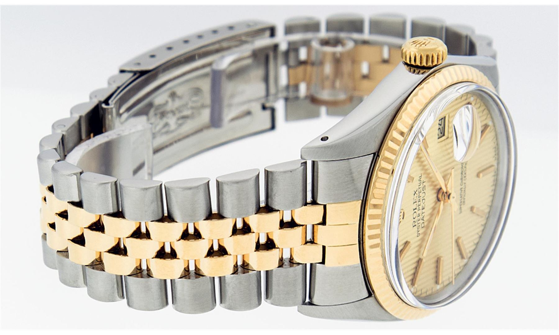 One Mens Two Tone Rolex Datejust Polished, Serviced & Electronically Tested, 14K Yellow Gold & Stainless Steel Case: 36mm,14K Yellow Gold Crown, Bezel: 14K Yellow Gold Fluted Bezel. Custom Crystal: Acrylic Cyclops Lens. Movement: Automatic Winding Movement Caliber 3035. Dial: Champagne Tapestry Dial With Index Hour Markers and Small Track. Date Window: 3 O'Clock Position Date Display, Quickset, Model: 16013 Condition: G-6 Extra Fine. Bracelet: Two Tone 14K Yellow Gold & Stainless Steel Jubilee. Bright Polish. 7.0 Inch Length, Adjustable. Standard Clasp, With Rolex Logo. Comes with 6 month warranty.