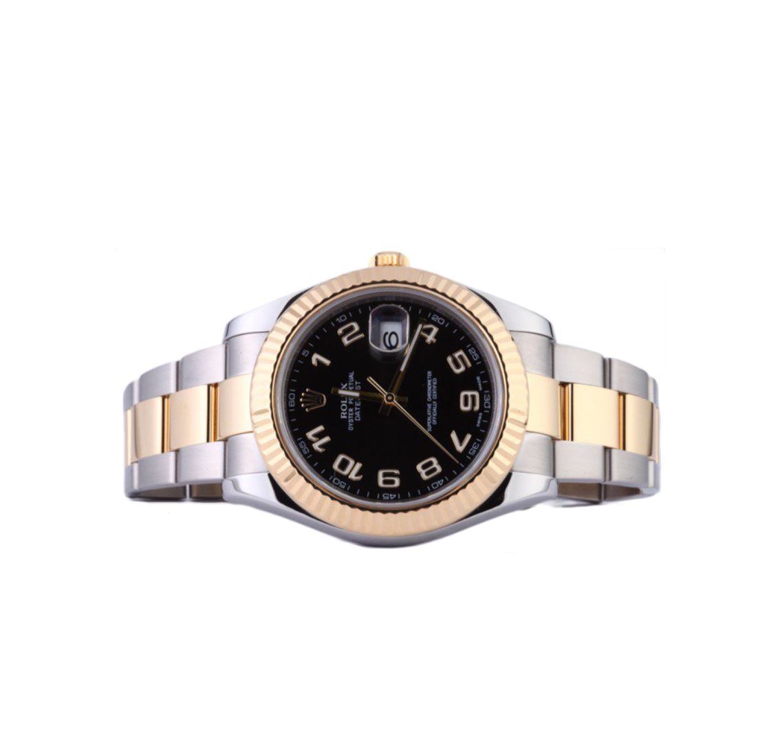One gents stainless steel and 18KT yellow gold Rolex DateJust wristwatch. Model Name/Number: DateJust 116333. The watch features automatic movement with date, scratch-resistant sapphire crystal, waterproof screw-down crown. Case: Stainless steel with 18k yellow gold fluted bezel (41mm), inner reflector ring engraved with serial number. Dial: Black Arabic. Bracelet: Stainless steel and 18k yellow gold Oyster.