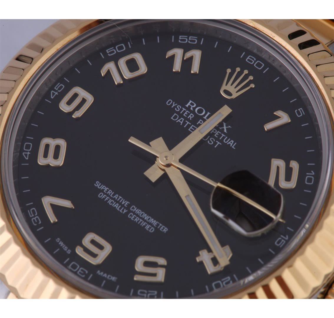 One gents stainless steel and 18KT yellow gold Rolex DateJust wristwatch. Model Name/Number: DateJust 116333. The watch features automatic movement with date, scratch-resistant sapphire crystal, waterproof screw-down crown. Case: Stainless steel with 18k yellow gold fluted bezel (41mm), inner reflector ring engraved with serial number. Dial: Black Arabic. Bracelet: Stainless steel and 18k yellow gold Oyster.