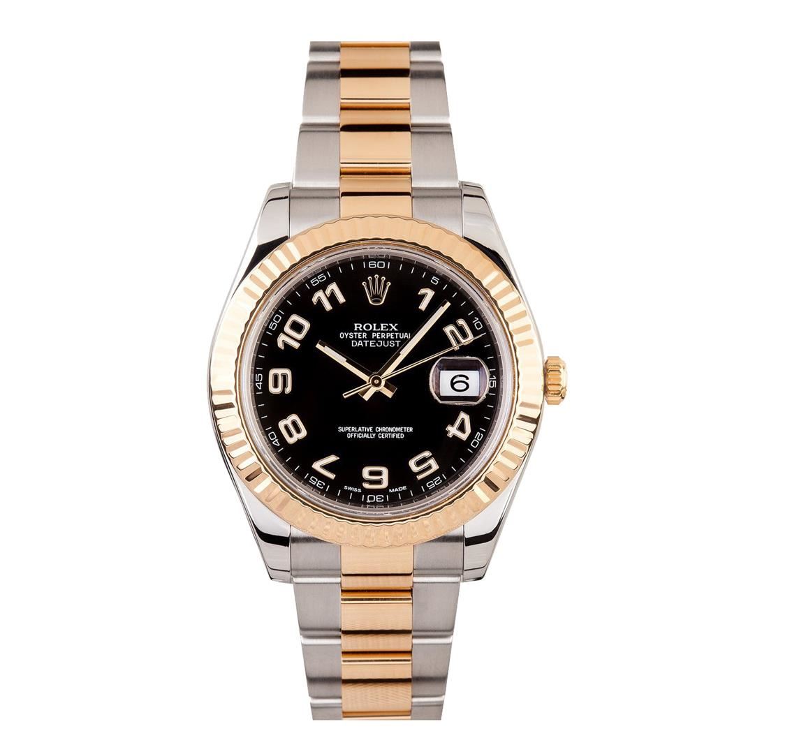 One gents stainless steel and 18KT yellow gold Rolex DateJust wristwatch. Model Name/Number: DateJust 116333. The watch features automatic movement with date, scratch-resistant sapphire crystal, waterproof screw-down crown. Case: Stainless steel with 18k yellow gold fluted bezel (41mm), inner reflector ring engraved with serial number. Dial: Black Arabic. Bracelet: Stainless steel and 18k yellow gold Oyster.