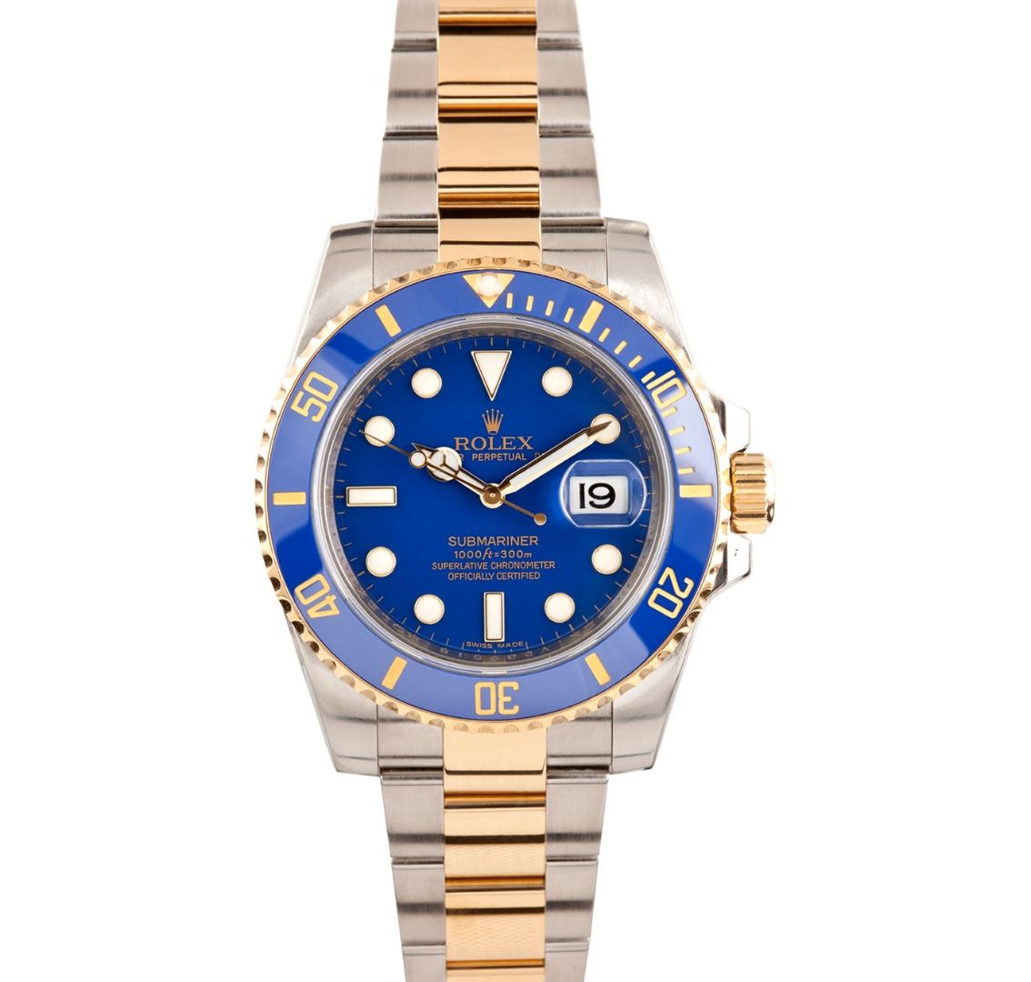 One gents stainless steel and 18KT yellow gold Rolex Submariner wristwatch. Model Name/Number: Submariner 116613. The watch features automatic movement with date, waterproof screw-down crown, scratch resistant sapphire crystal, rotatable diver's ceramic bezel. Case: 18k gold & stainless steel (40mm). Dial: Blue with luminous hour markers. Bracelet: 18k yellow gold and stainless with Glidelock clasp.