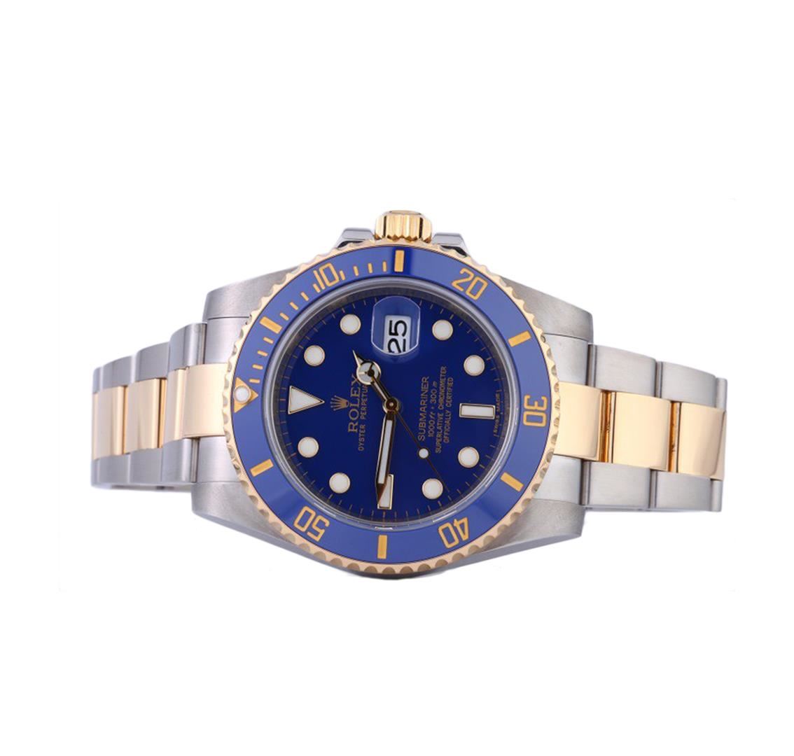 One gents stainless steel and 18KT yellow gold Rolex Submariner wristwatch. Model Name/Number: Submariner 116613. The watch features automatic movement with date, waterproof screw-down crown, scratch resistant sapphire crystal, rotatable diver's ceramic bezel. Case: 18k gold & stainless steel (40mm). Dial: Blue with luminous hour markers. Bracelet: 18k yellow gold and stainless with Glidelock clasp.
