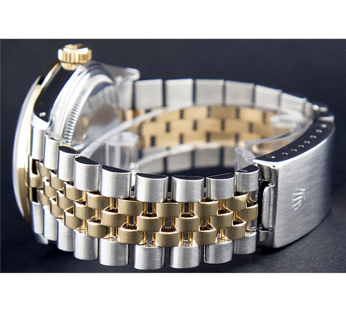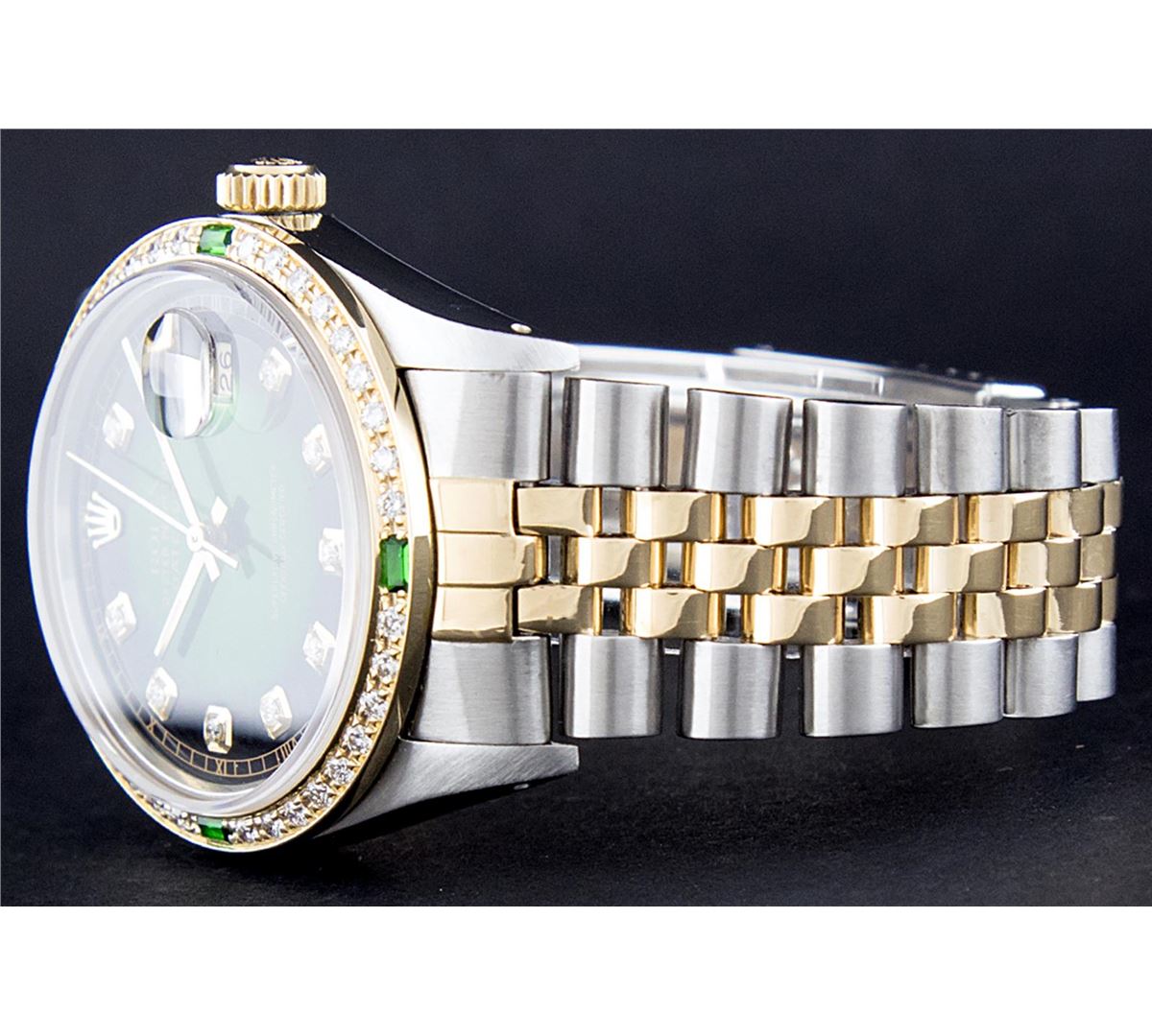 One Mens Two Tone Rolex Datejust Polished, Serviced & Electronically Tested, 14K Yellow Gold & Stainless Steel Case:36mm, 14K Yellow Gold Crown, Custom Bezel: 18K Yellow Gold Emerald Beadset Diamond Bezel, Diamond Count: 36 Diamonds + 4 Emeralds Total Weight 1.00 Carat, Clarity: Si-VS, Color: G to H. Custom Crystal: Synthetic Sapphire Cyclops Lens. Movement: Automatic Winding Movement Caliber 3035. Custom Dial: Green Vignette With Diamond Hour Markers. Diamond Count: 10 Diamonds Clarity: SI-VS, Color: Color G to H Date Window: 3 O'Clock Position Date Display, Quickset, Model: 16013 Condition: G-6 Extra Fine. Bracelet: Two Tone 14K Yellow Gold & Stainless Steel Jubilee. Bright Polish. 7.0 Inch Length, Adjustable. Standard Clasp, With Rolex Logo.