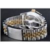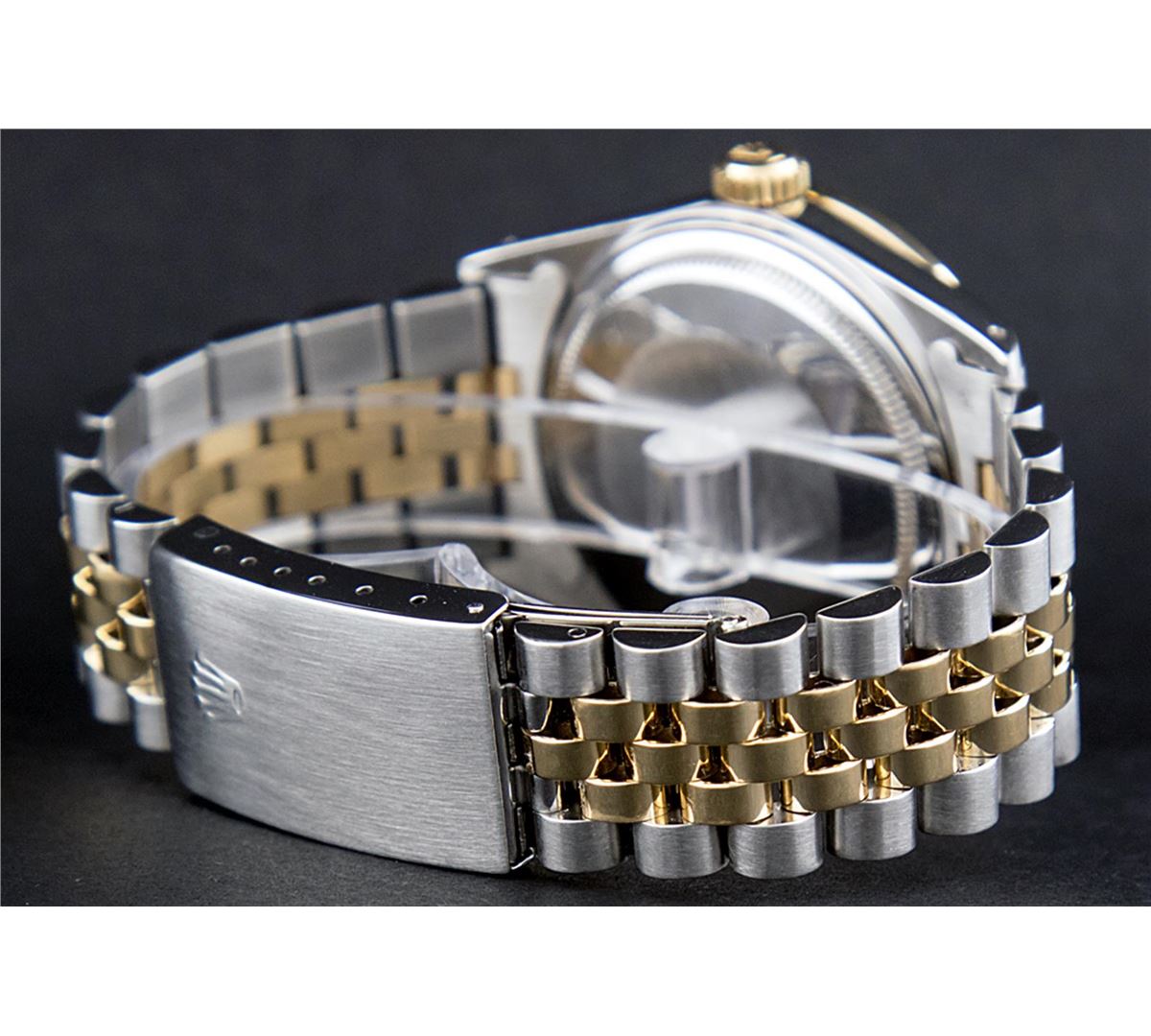 One Mens Two Tone Rolex Datejust Polished, Serviced & Electronically Tested, 14K Yellow Gold & Stainless Steel Case:36mm, 14K Yellow Gold Crown, Custom Bezel: 18K Yellow Gold Emerald Beadset Diamond Bezel, Diamond Count: 36 Diamonds + 4 Emeralds Total Weight 1.00 Carat, Clarity: Si-VS, Color: G to H. Custom Crystal: Synthetic Sapphire Cyclops Lens. Movement: Automatic Winding Movement Caliber 3035. Custom Dial: Green Vignette With Diamond Hour Markers. Diamond Count: 10 Diamonds Clarity: SI-VS, Color: Color G to H Date Window: 3 O'Clock Position Date Display, Quickset, Model: 16013 Condition: G-6 Extra Fine. Bracelet: Two Tone 14K Yellow Gold & Stainless Steel Jubilee. Bright Polish. 7.0 Inch Length, Adjustable. Standard Clasp, With Rolex Logo.