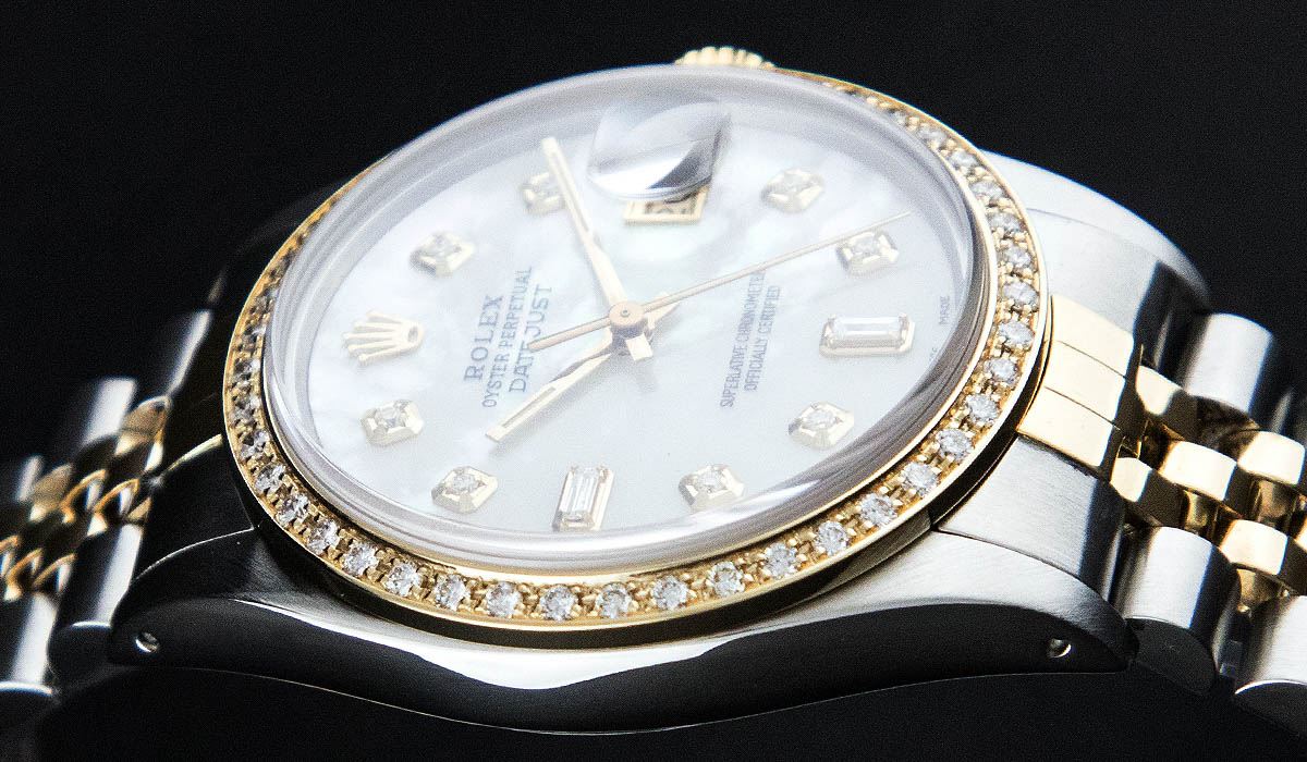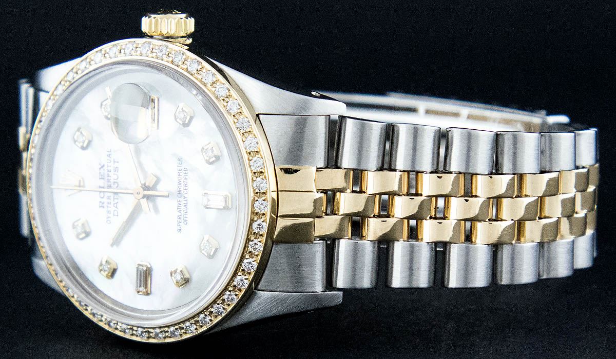 One Gents Two Tone Rolex Datejust Polished, Serviced & Electronically Tested, 14K Yellow Gold & Stainless Steel Case:36mm, 14K Yellow Gold Crown, Custom Bezel: 18K Yellow Gold Bead Set Diamond Bezel, Diamond Count: 44 Diamonds Total Weight 1.0 Carat, Clarity: Si-VS, Color: G to H. Custom Crystal: Synthetic Sapphire Cyclops Lens. Movement: Automatic Winding Movement Caliber 3035. Custom Dial: Mother Of Pearl Diamond + Baguette Dial, Diamond Count: 8 Diamonds + 2 Baguette, Color: G to H, Clarity: SI-VS Date Window: 3 O'Clock Position Date Display, Quickset, Model: 16013 Condition: G-6 Extra Fine. Bracelet: Two Tone 14K Yellow Gold & Stainless Steel Jubilee. Bright Polish. 6.5 Inch Length, Adjustable. Standard Clasp, With Rolex Logo.