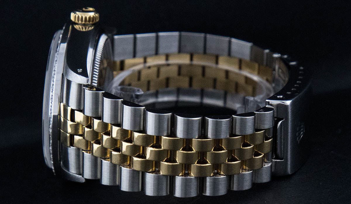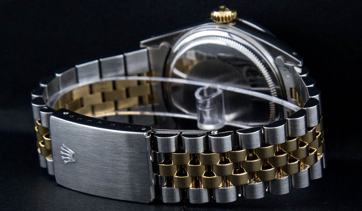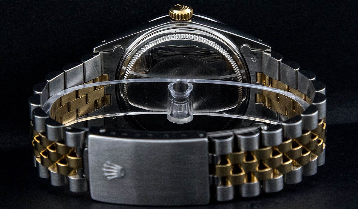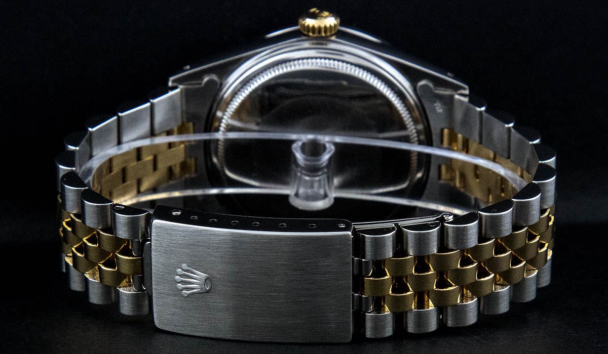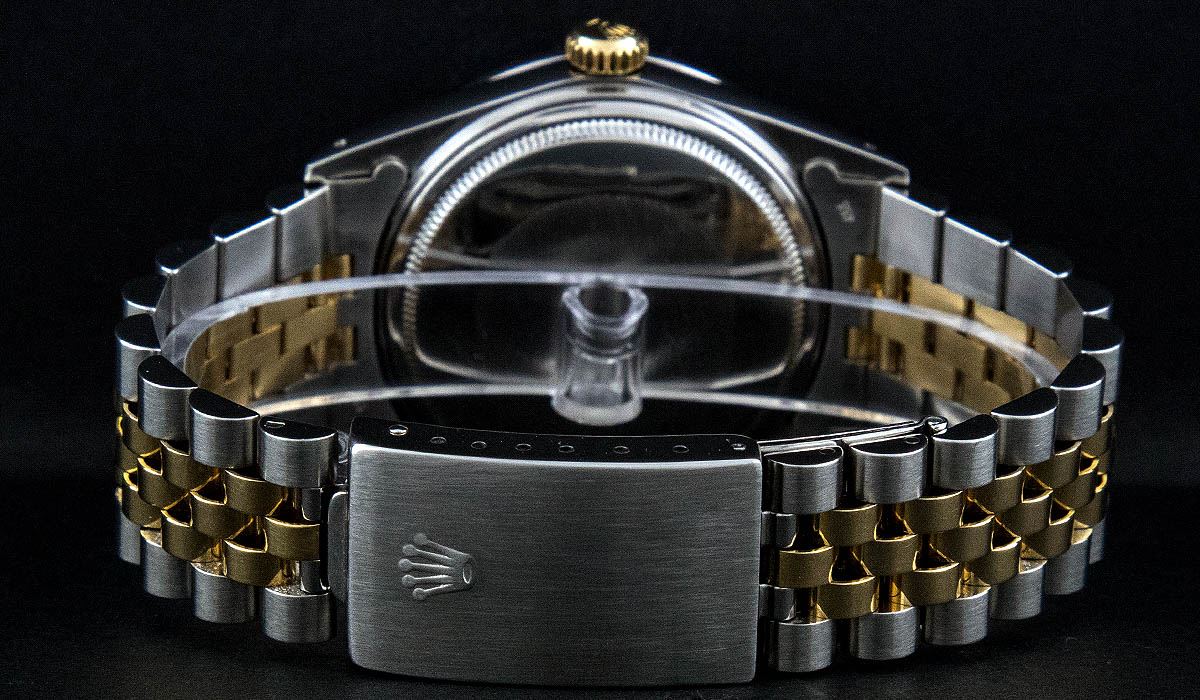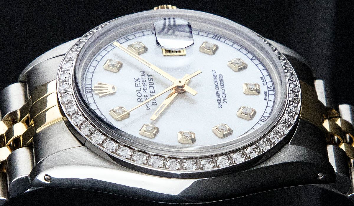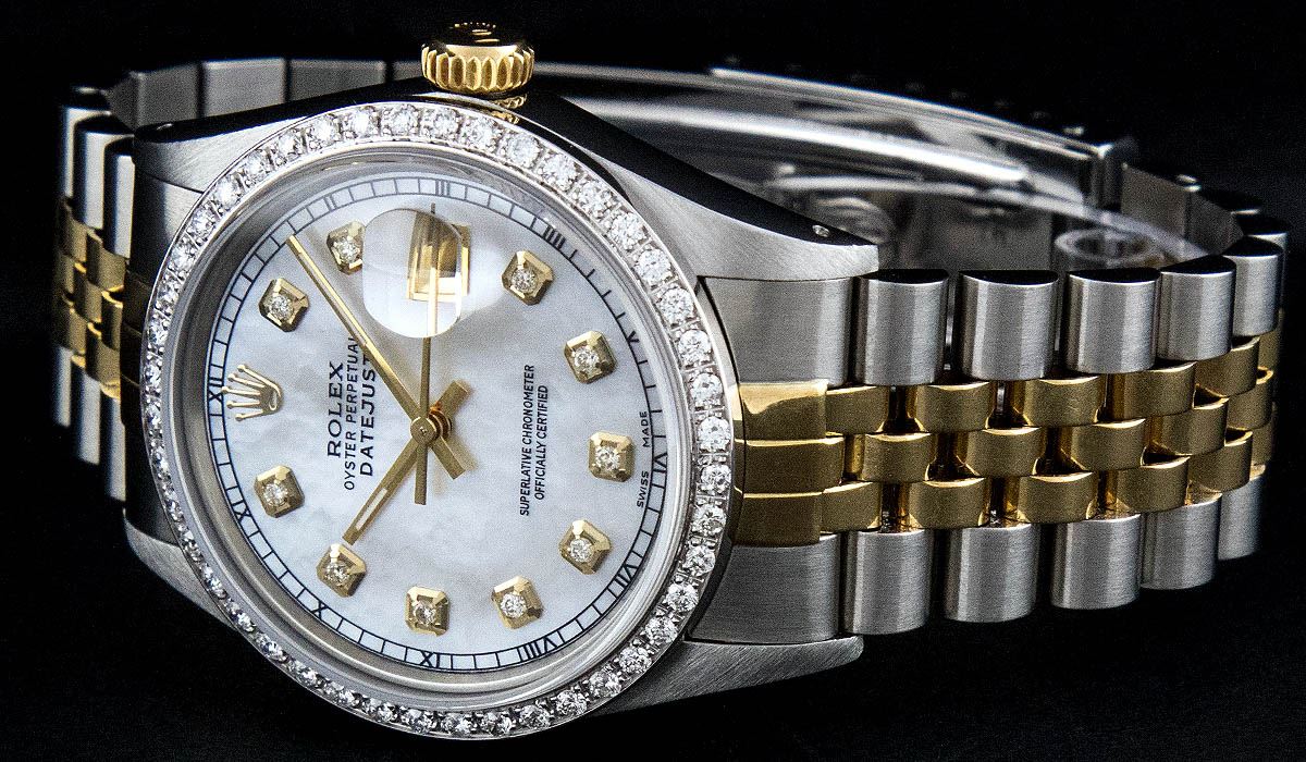 One Mens Two Tone Rolex Datejust Polished, Serviced & Electronically Tested, 14K Yellow Gold & Stainless Steel Case:36mm, 14K Yellow Gold Crown, Custom Bezel: 18K White Gold Beadset Diamond Bezel, Diamond Count: 44 Diamonds, Total Weight 1.00 Carat, Clarity: Si-VS, Color: G to H. Custom Crystal: Synthetic Sapphire Cyclops Lens. Movement: Automatic Winding Movement Caliber 3035. Custom Dial: Mother Of Pearl Diamond Dial, 10 Diamonds in Dial G To H In Color, Si-VS Clarity, Date Window: 3 O'Clock Position Date Display, Quickset, Model: 16013 Condition: G-6 Extra Fine. Bracelet: Two Tone 14K Yellow Gold & Stainless Steel Jubilee. Bright Polish. 6.5 Inch Length, Adjustable. Standard Clasp, With Rolex Logo.
