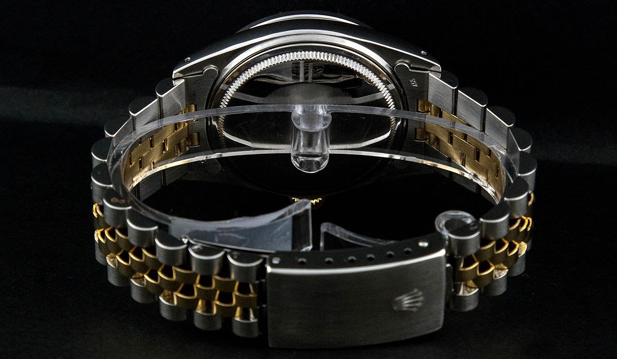 One Mens Two Tone Rolex Datejust Polished, Serviced & Electronically Tested, 14K Yellow Gold & Stainless Steel Case:36mm, 14K Yellow Gold Crown, Custom Bezel: 18K White Gold Beadset Diamond Bezel, Diamond Count: 44 Diamonds, Total Weight 1.00 Carat, Clarity: Si-VS, Color: G to H. Custom Crystal: Synthetic Sapphire Cyclops Lens. Movement: Automatic Winding Movement Caliber 3035. Custom Dial: Mother Of Pearl Diamond Dial, 10 Diamonds in Dial G To H In Color, Si-VS Clarity, Date Window: 3 O'Clock Position Date Display, Quickset, Model: 16013 Condition: G-6 Extra Fine. Bracelet: Two Tone 14K Yellow Gold & Stainless Steel Jubilee. Bright Polish. 6.5 Inch Length, Adjustable. Standard Clasp, With Rolex Logo.