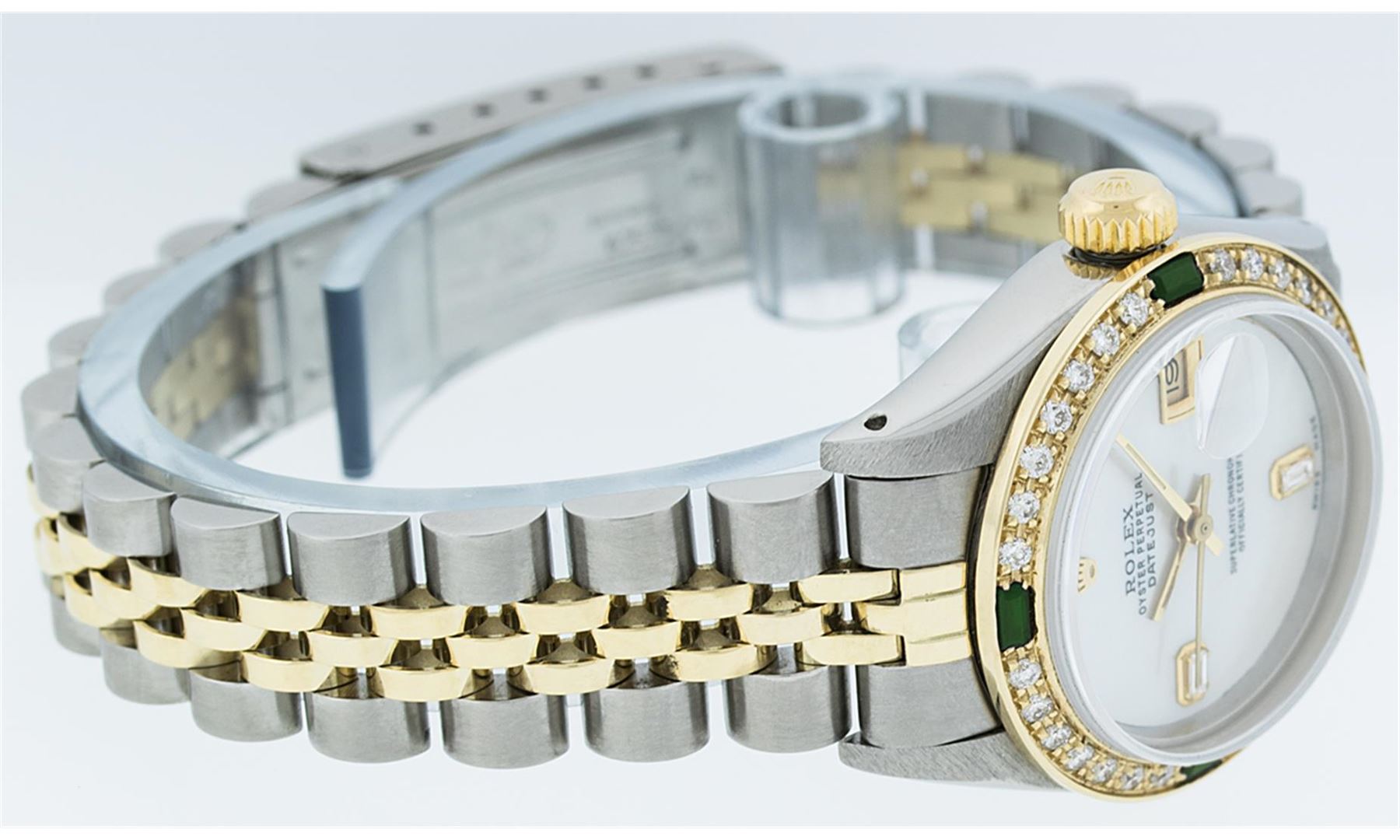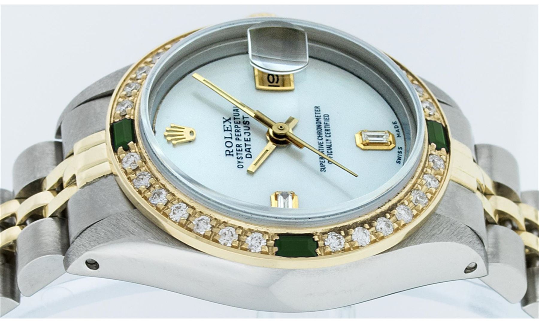 One Ladies Two Tone Rolex Datejust Polished, Serviced & Electronically Tested, 14K Yellow Gold & Stainless Steel Case:26mm, 14K Yellow Gold Crown, Custom Bezel: 18K Yellow Gold Emerald Beadset Diamond Bezel, Stone Count: 28 Diamonds + 4 Emeralds, Total Weight .70 Carat, Clarity: Si-VS, Color: G to H. Custom Crystal: Synthetic Sapphire Cyclops Lens. Movement: Automatic Winding Movement Caliber 2030. Custom Dial: Mother Of Pearl With Baguette Diamonds, Stone Count: 2 Baguette Diamonds in Dial. Date Window: 3 O'clock Position Date Display, Non Quickset, Model: Datejust, Condition: G-6 Extra Fine. Bracelet: Two Tone 14K Yellow Gold & Stainless Steel Jubilee. Bright Polish. 6.0 Inch Length, Adjustable. Standard Clasp, With Rolex Logo. Comes with 6 month warranty.