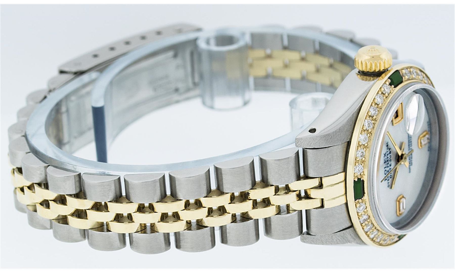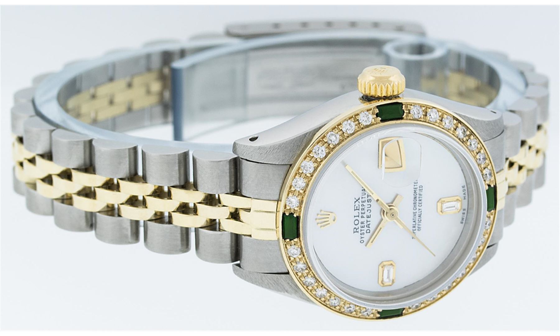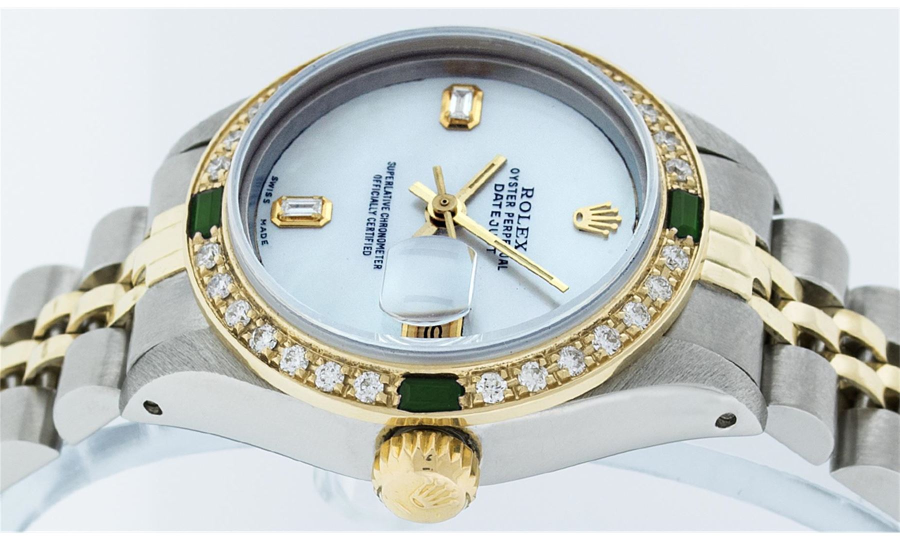 One Ladies Two Tone Rolex Datejust Polished, Serviced & Electronically Tested, 14K Yellow Gold & Stainless Steel Case:26mm, 14K Yellow Gold Crown, Custom Bezel: 18K Yellow Gold Emerald Beadset Diamond Bezel, Stone Count: 28 Diamonds + 4 Emeralds, Total Weight .70 Carat, Clarity: Si-VS, Color: G to H. Custom Crystal: Synthetic Sapphire Cyclops Lens. Movement: Automatic Winding Movement Caliber 2030. Custom Dial: Mother Of Pearl With Baguette Diamonds, Stone Count: 2 Baguette Diamonds in Dial. Date Window: 3 O'clock Position Date Display, Non Quickset, Model: Datejust, Condition: G-6 Extra Fine. Bracelet: Two Tone 14K Yellow Gold & Stainless Steel Jubilee. Bright Polish. 6.0 Inch Length, Adjustable. Standard Clasp, With Rolex Logo. Comes with 6 month warranty.