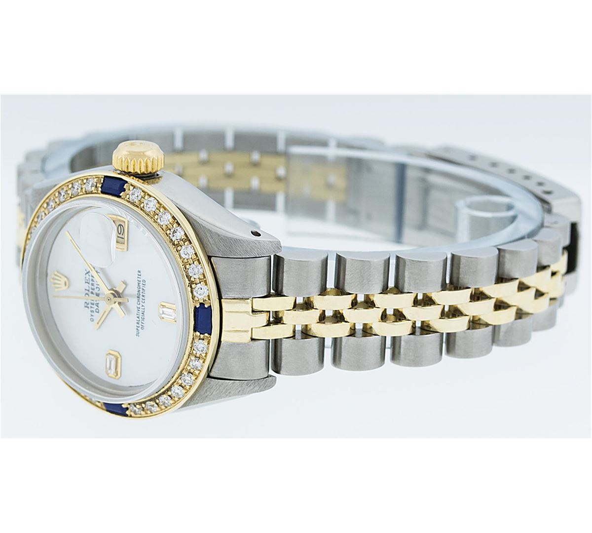 One Ladies Two Tone Rolex Datejust Polished, Serviced & Electronically Tested, 14K Yellow Gold & Stainless Steel Case:26mm, 14K Yellow Gold Crown, Custom Bezel: 18K Yellow Gold Sapphire Beadset Diamond Bezel, Stone Count: 28 Diamonds + 4 Sapphires, Total Weight .70 Carat, Clarity: Si-VS, Color: G to H. Custom Crystal: Synthetic Sapphire Cyclops Lens. Movement: Automatic Winding Movement Caliber 2030. Custom Dial: Mother Of Pearl With Baguette Diamonds, Stone Count: 2 Baguette Diamonds in Dial. Date Window: 3 O'clock Position Date Display, Model: Datejust, Condition: G-6 Extra Fine. Bracelet: Two Tone 14K Yellow Gold & Stainless Steel Jubilee. Bright Polish. 6.0 Inch Length, Adjustable. Standard Clasp, With Rolex Logo. Comes with 6 month warranty.