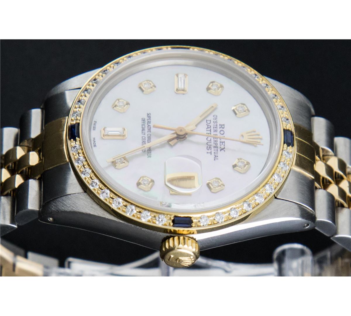 One Mens Two Tone Rolex Datejust Polished, Serviced & Electronically Tested, 14K Yellow Gold & Stainless Steel Case:36mm, 14K Yellow Gold Crown, Custom Bezel: 18K Yellow Gold Sapphire Beadset Diamond Bezel, Diamond Count: 36 Diamonds + 4 Sapphires Total Weight 1.00 Carat, Clarity: Si-VS, Color: G to H. Custom Crystal: Synthetic Sapphire Cyclops Lens. Movement: Automatic Winding Movement Caliber 3035. Custom Dial: Mother Of Pearl Dial Set With Diamond Hour Markers and Baguette Markers On 6 and 9, Diamond Count: 8 + 2 Baguette Diamonds in Dial G To H In Color , Date Window: 3 O'Clock Position Date Display, Quickset, Model: 16013 Condition: G-6 Extra Fine. Bracelet: Two Tone 14K Yellow Gold & Stainless Steel Jubilee. Bright Polish. 7.0 Inch Length, Adjustable. Standard Clasp, With Rolex Logo.