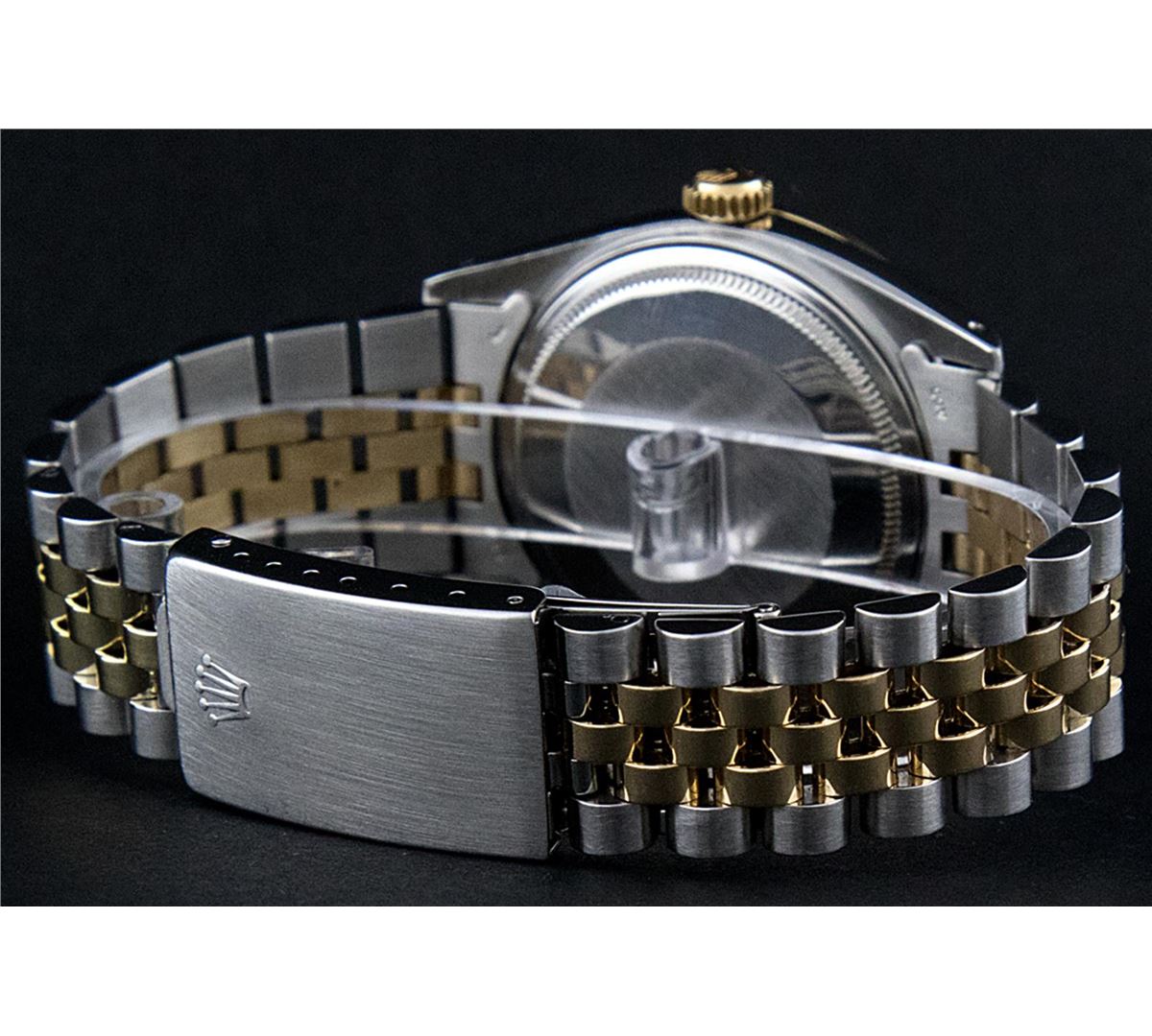 One Mens Two Tone Rolex Datejust Polished, Serviced & Electronically Tested, 14K Yellow Gold & Stainless Steel Case:36mm, 14K Yellow Gold Crown, Custom Bezel: 18K Yellow Gold Sapphire Beadset Diamond Bezel, Diamond Count: 36 Diamonds + 4 Sapphires Total Weight 1.00 Carat, Clarity: Si-VS, Color: G to H. Custom Crystal: Synthetic Sapphire Cyclops Lens. Movement: Automatic Winding Movement Caliber 3035. Custom Dial: Mother Of Pearl Dial Set With Diamond Hour Markers and Baguette Markers On 6 and 9, Diamond Count: 8 + 2 Baguette Diamonds in Dial G To H In Color , Date Window: 3 O'Clock Position Date Display, Quickset, Model: 16013 Condition: G-6 Extra Fine. Bracelet: Two Tone 14K Yellow Gold & Stainless Steel Jubilee. Bright Polish. 7.0 Inch Length, Adjustable. Standard Clasp, With Rolex Logo.