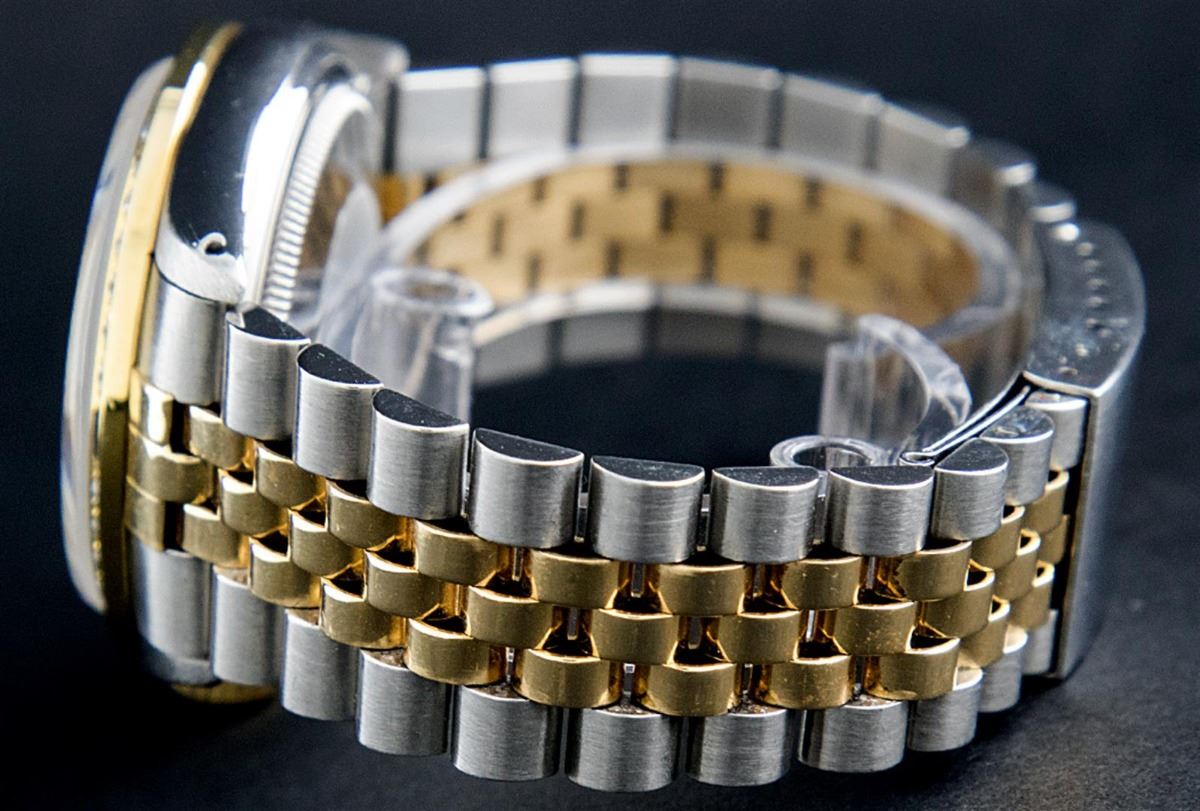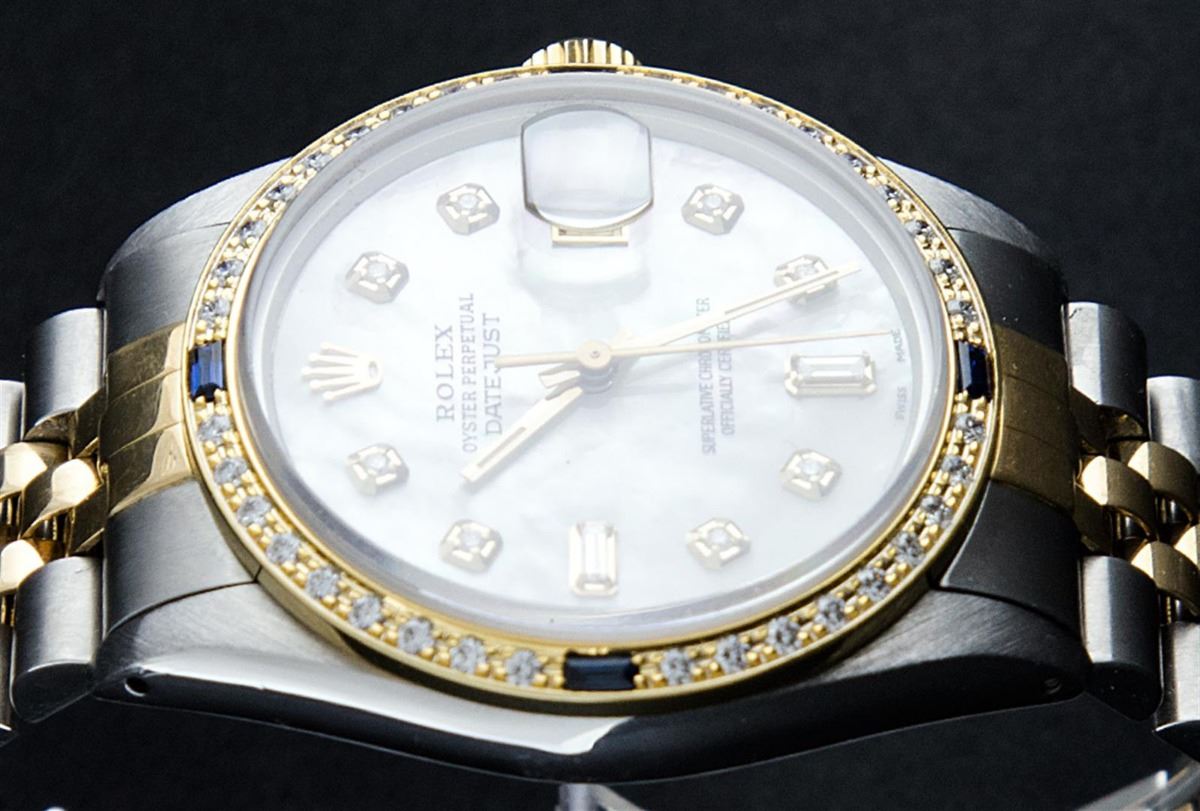One Mens Two Tone Rolex Datejust Polished, Serviced & Electronically Tested, 14K Yellow Gold & Stainless Steel Case:36mm, 14K Yellow Gold Crown, Custom Bezel: 18K Yellow Gold Sapphire Beadset Diamond Bezel, Diamond Count: 36 Diamonds + 4 Sapphires Total Weight 1.00 Carat, Clarity: Si-VS, Color: G to H. Custom Crystal: Synthetic Sapphire Cyclops Lens. Movement: Automatic Winding Movement Caliber 3035. Custom Dial: Mother Of Pearl Dial Set With Diamond Hour Markers and Baguette Markers On 6 and 9, Diamond Count: 8 + 2 Baguette Diamonds in Dial G To H In Color , Date Window: 3 O'Clock Position Date Display, Quickset, Model: 16013 Condition: G-6 Extra Fine. Bracelet: Two Tone 14K Yellow Gold & Stainless Steel Jubilee. Bright Polish. 7.0 Inch Length, Adjustable. Standard Clasp, With Rolex Logo.