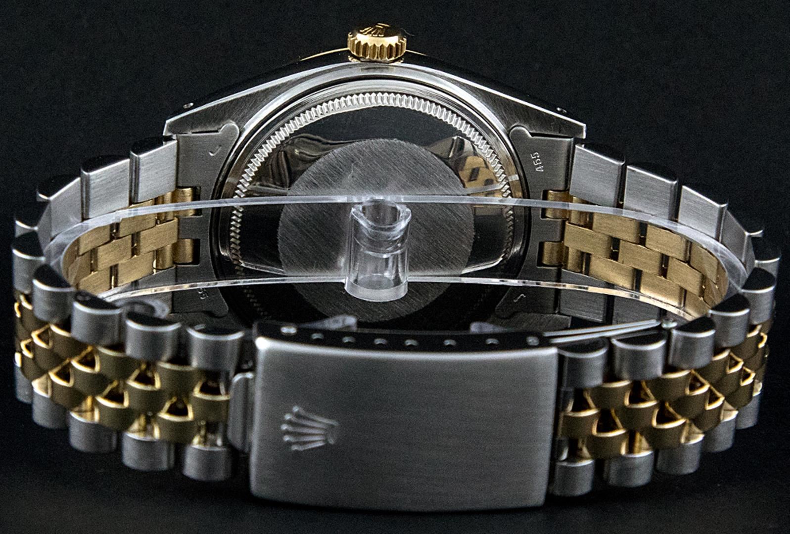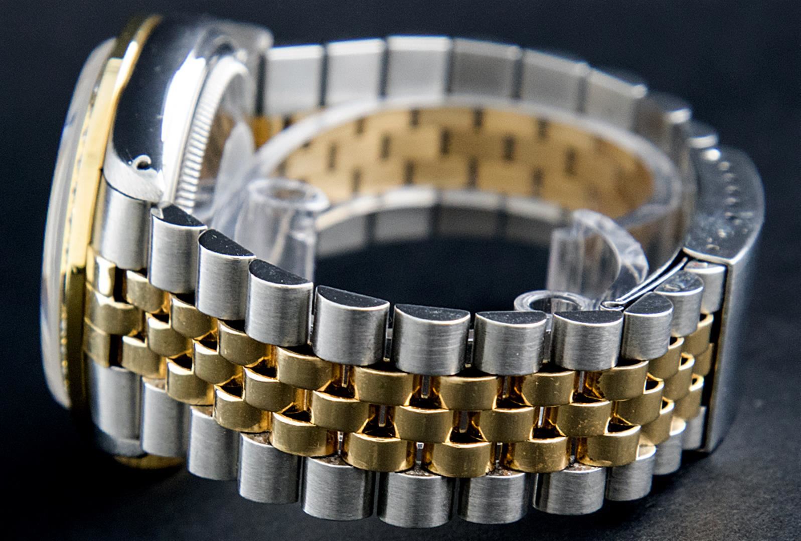 One Mens Two Tone Rolex Datejust Polished, Serviced & Electronically Tested, 14K Yellow Gold & Stainless Steel Case:36mm, 14K Yellow Gold Crown, Custom Bezel: 18K Yellow Gold Sapphire Beadset Diamond Bezel, Diamond Count: 36 Diamonds + 4 Sapphires Total Weight 1.00 Carat, Clarity: Si-VS, Color: G to H. Custom Crystal: Synthetic Sapphire Cyclops Lens. Movement: Automatic Winding Movement Caliber 3035. Custom Dial: Mother Of Pearl Dial Set With Diamond Hour Markers and Baguette Markers On 6 and 9, Diamond Count: 8 + 2 Baguette Diamonds in Dial G To H In Color , Date Window: 3 O'Clock Position Date Display, Quickset, Model: 16013 Condition: G-6 Extra Fine. Bracelet: Two Tone 14K Yellow Gold & Stainless Steel Jubilee. Bright Polish. 7.0 Inch Length, Adjustable. Standard Clasp, With Rolex Logo.