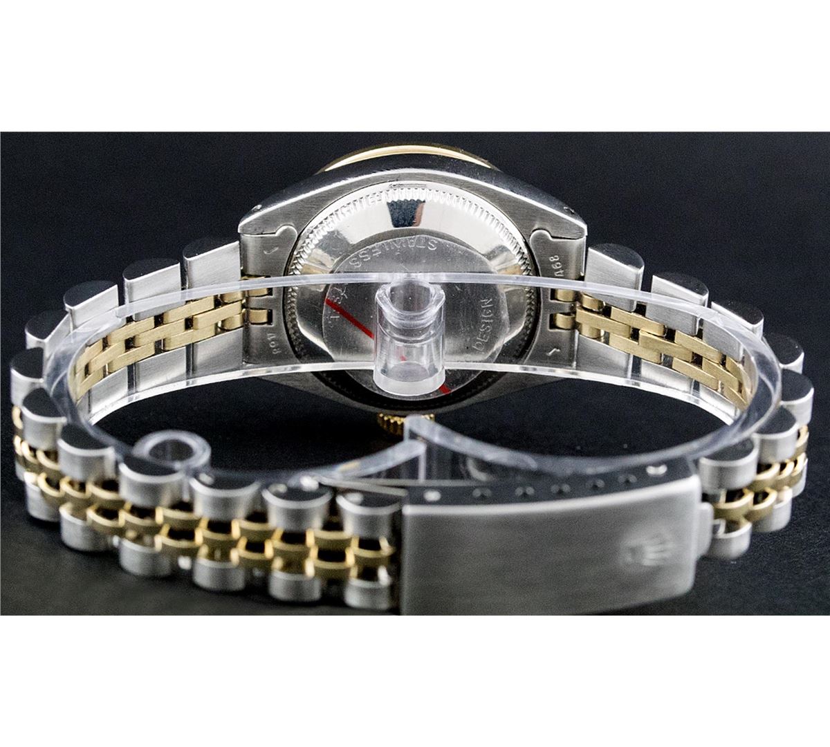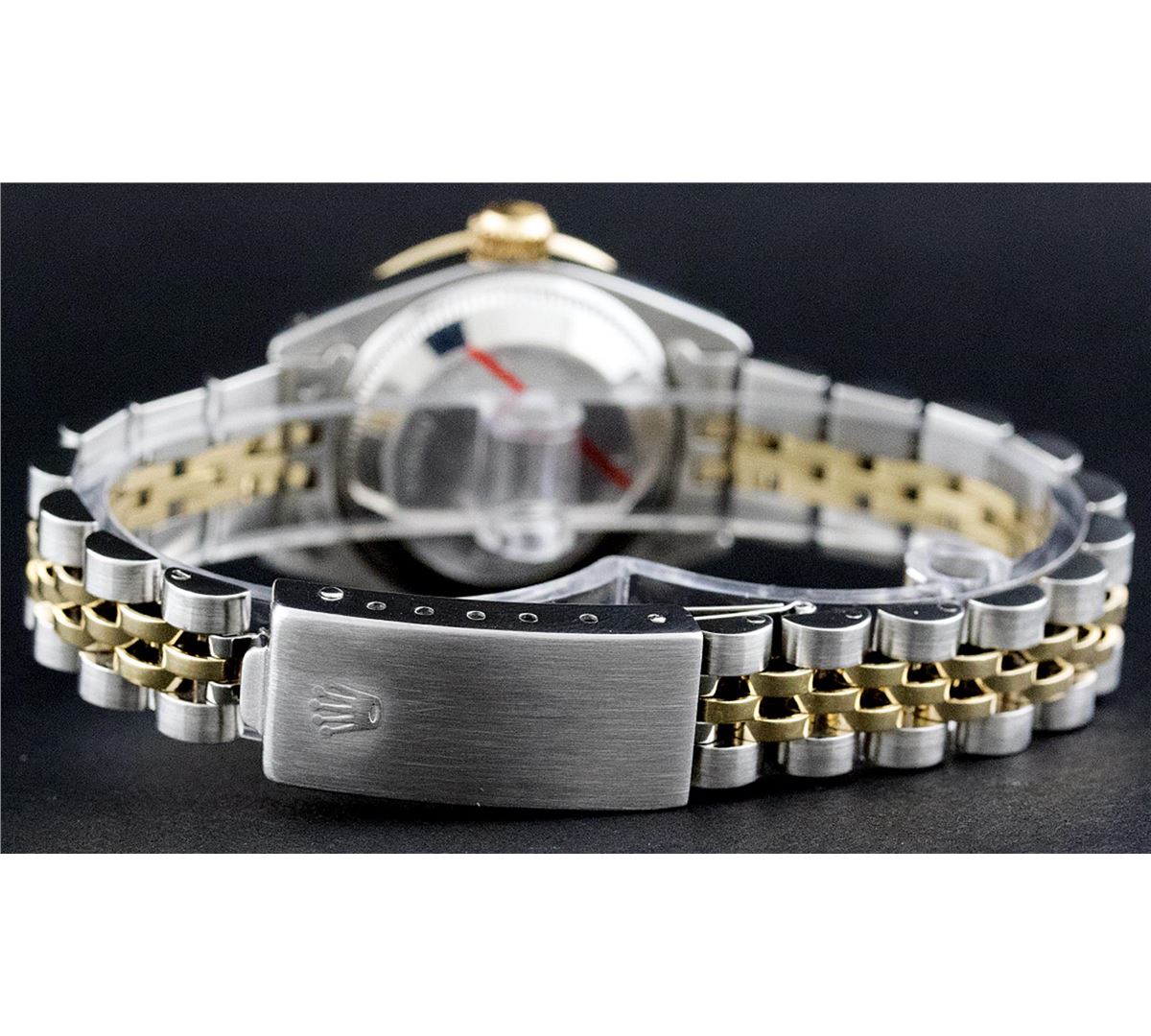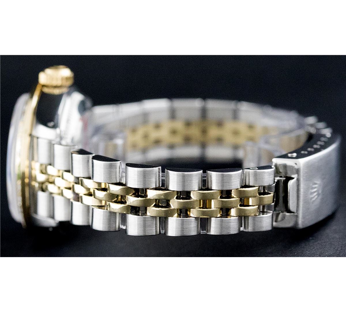 One Ladies Two Tone Rolex Datejust Polished, Serviced & Electronically Tested, 14K Yellow Gold & Stainless Steel Case:26mm, 14K Yellow Gold Crown, Custom Bezel: 18K Yellow Gold Emerald Beadset Diamond Bezel, Diamond Count: 28 Diamonds + 4 Emeralds, Total Weight .70 Carat, Clarity: Si-VS, Color: G to H. Custom Crystal: Synthetic Sapphire Cyclops Lens. Movement: Automatic Winding Movement Caliber 2030. Custom Dial: Mother Of Pearl Diamond Dial, Diamond Count: 10 Diamonds In Dial, Clarity: Si-VS, Color: G to H. Date Window: 3 O'Clock Position Date Display, Non Quickset, Model: 6917 Condition: G-6 Extra Fine. Bracelet: Two Tone 14K Yellow Gold & Stainless Steel Jubilee. Bright Polish. 5.5 Inch Length, Adjustable. Standard Clasp, With Rolex Logo.