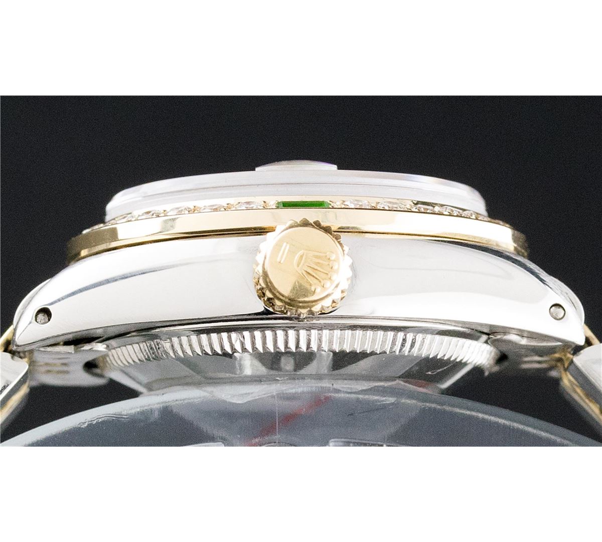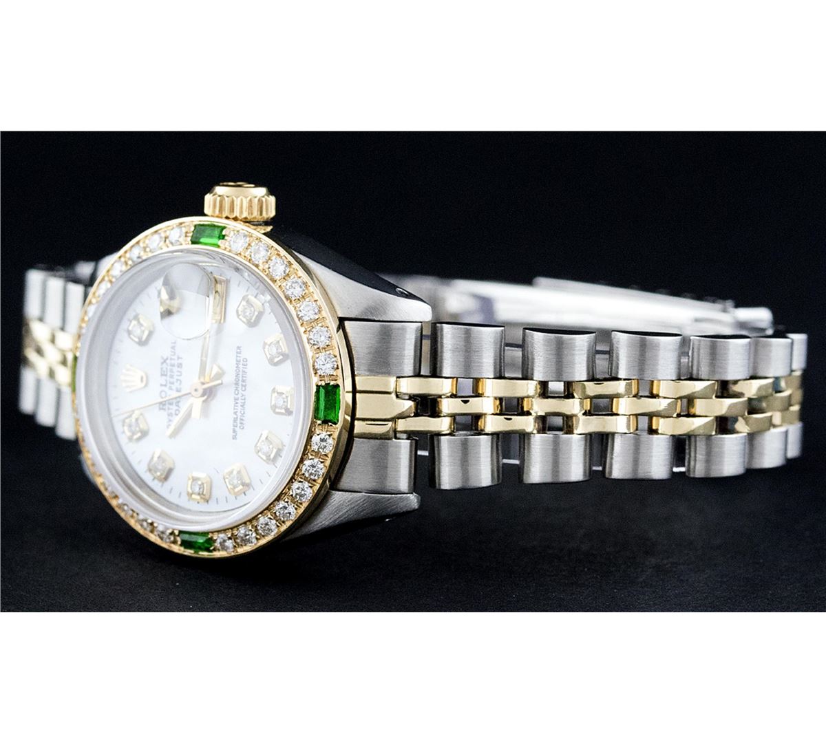 One Ladies Two Tone Rolex Datejust Polished, Serviced & Electronically Tested, 14K Yellow Gold & Stainless Steel Case:26mm, 14K Yellow Gold Crown, Custom Bezel: 18K Yellow Gold Emerald Beadset Diamond Bezel, Diamond Count: 28 Diamonds + 4 Emeralds, Total Weight .70 Carat, Clarity: Si-VS, Color: G to H. Custom Crystal: Synthetic Sapphire Cyclops Lens. Movement: Automatic Winding Movement Caliber 2030. Custom Dial: Mother Of Pearl Diamond Dial, Diamond Count: 10 Diamonds In Dial, Clarity: Si-VS, Color: G to H. Date Window: 3 O'Clock Position Date Display, Non Quickset, Model: 6917 Condition: G-6 Extra Fine. Bracelet: Two Tone 14K Yellow Gold & Stainless Steel Jubilee. Bright Polish. 5.5 Inch Length, Adjustable. Standard Clasp, With Rolex Logo.