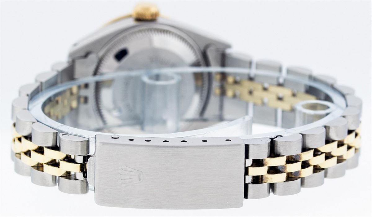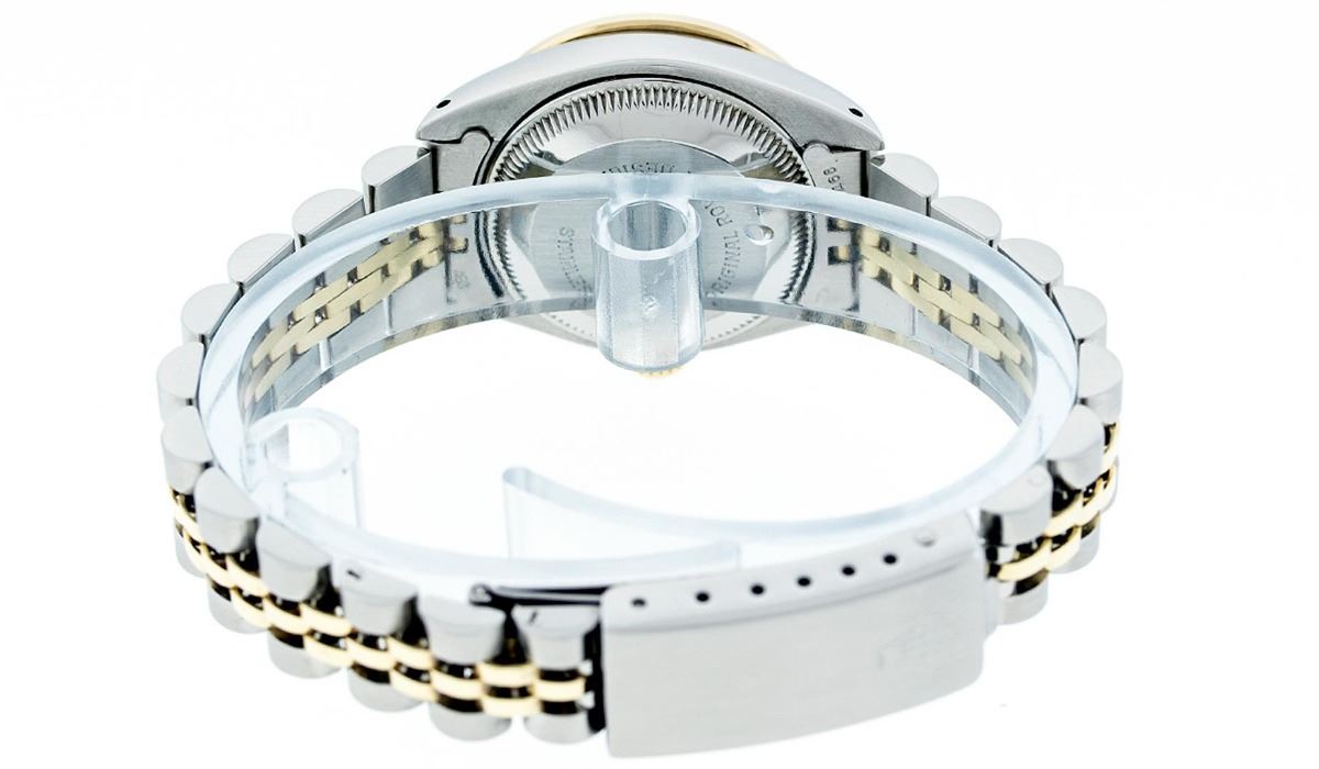 One Ladies Two Tone Rolex Datejust Polished, Serviced & Electronically Tested, 14K Yellow Gold & Stainless Steel Case:26mm, 14K Yellow Gold Crown, Custom Bezel: 18K Yellow Gold Beadset Diamond Bezel, Diamond Count: 32 Diamonds Total Weight .70 Carat, Clarity: Si-VS, Color: G to H. Custom Crystal: Synthetic Sapphire Cyclops Lens. Movement: Automatic Winding Movement Caliber 2030. Custom Dial: Mother Of Pearl String Diamond Dial, Diamond Count: 43 Diamonds, Clarity: SI-VS, Color: G to H. Date Window: 3 O'Clock Position Date Display Model: Datejust. Condition: G-6 Extra Fine. Bracelet: Two Tone 14K Yellow Gold & Stainless Steel Jubilee. Bright Polish. 5.5 Inch Length, Adjustable. Standard Clasp, With Rolex Logo. Comes with a 6 month warranty card.