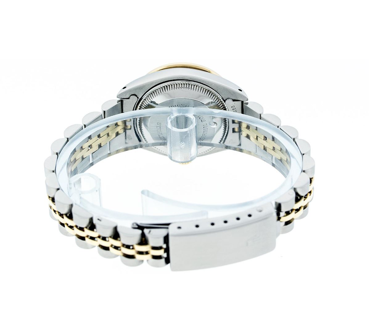 One Ladies Two Tone Rolex Datejust Polished, Serviced & Electronically Tested, 14K Yellow Gold & Stainless Steel Case:26mm, 14K Yellow Gold Crown, Custom Bezel: 18K Yellow Gold Beadset Diamond Bezel, Diamond Count: 32 Diamonds Total Weight .70 Carat, Clarity: Si-VS, Color: G to H. Custom Crystal: Synthetic Sapphire Cyclops Lens. Movement: Automatic Winding Movement Caliber 2030. Custom Dial: Mother Of Pearl String Diamond Dial, Diamond Count: 43 Diamonds, Clarity: SI-VS, Color: G to H. Date Window: 3 O'Clock Position Date Display Model: Datejust. Condition: G-6 Extra Fine. Bracelet: Two Tone 14K Yellow Gold & Stainless Steel Jubilee. Bright Polish. 5.5 Inch Length, Adjustable. Standard Clasp, With Rolex Logo. Comes with a 6 month warranty card.