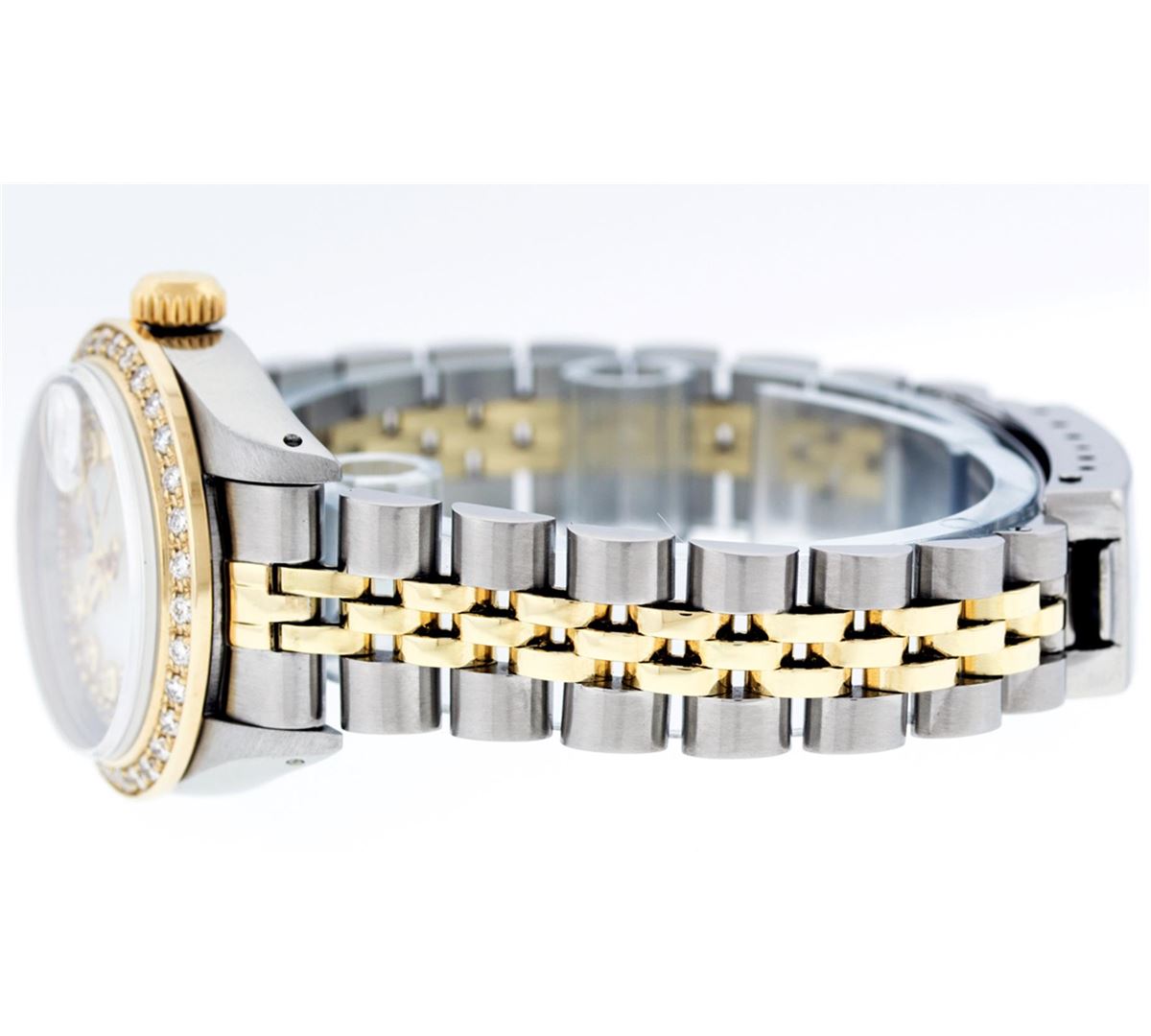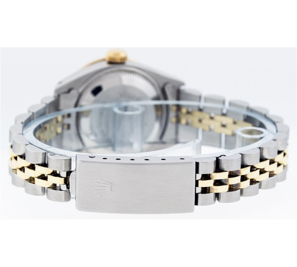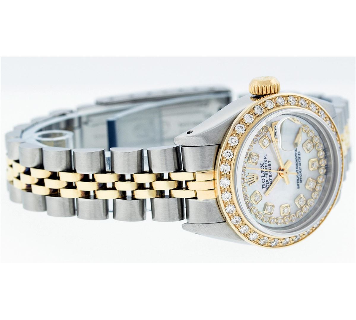 One Ladies Two Tone Rolex Datejust Polished, Serviced & Electronically Tested, 14K Yellow Gold & Stainless Steel Case:26mm, 14K Yellow Gold Crown, Custom Bezel: 18K Yellow Gold Beadset Diamond Bezel, Diamond Count: 32 Diamonds Total Weight .70 Carat, Clarity: Si-VS, Color: G to H. Custom Crystal: Synthetic Sapphire Cyclops Lens. Movement: Automatic Winding Movement Caliber 2030. Custom Dial: Mother Of Pearl String Diamond Dial, Diamond Count: 43 Diamonds, Clarity: SI-VS, Color: G to H. Date Window: 3 O'Clock Position Date Display Model: Datejust. Condition: G-6 Extra Fine. Bracelet: Two Tone 14K Yellow Gold & Stainless Steel Jubilee. Bright Polish. 5.5 Inch Length, Adjustable. Standard Clasp, With Rolex Logo. Comes with a 6 month warranty card.