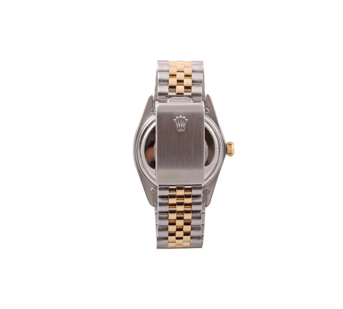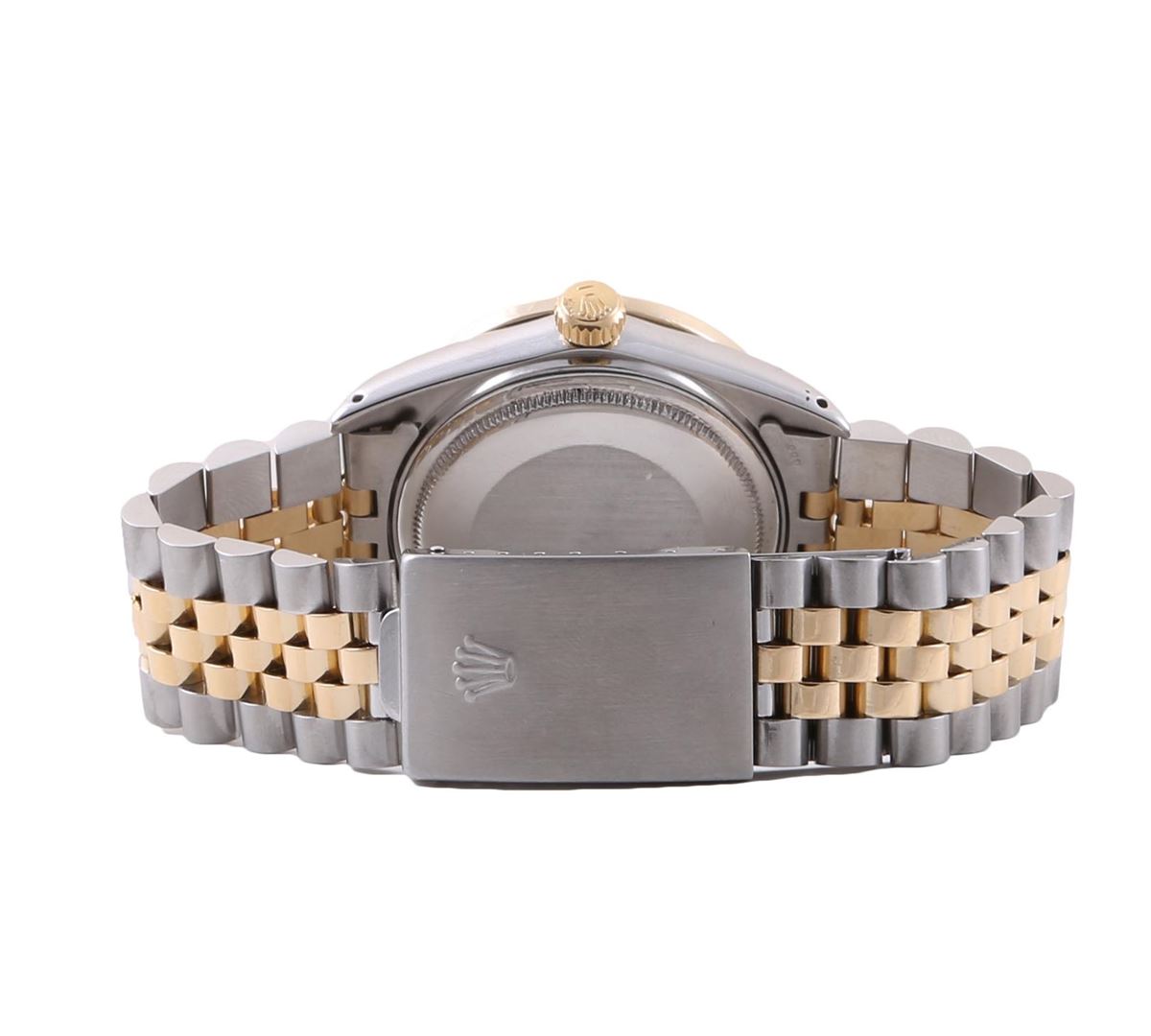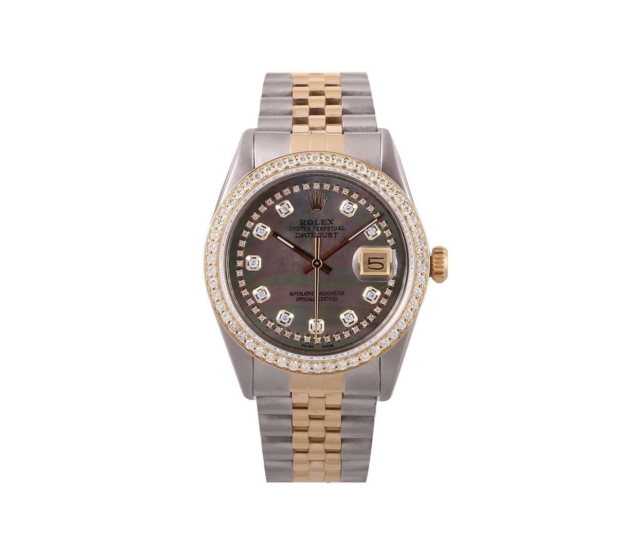 One Mens Two Tone Rolex Datejust Polished, Serviced & Electronically Tested, 14K Yellow Gold & Stainless Steel Case:36mm, 14K Yellow Gold Crown, Custom Bezel: 18K Yellow Gold Beadset Diamond Bezel, Diamond Count: 44 Diamonds Total Weight 1.00 Carat, Clarity: Si-VS, Color: G to H. Custom Crystal: Synthetic Sapphire Cyclops Lens. Movement: Automatic Winding Movement Caliber 3035. Custom Refinished Dial: Mother Of Pearl Tahitian String Diamond Dial, Diamond Count: 58 Diamonds In Dial in Dial G To H In Color, SI-VS Clarity. Date Window: 3 O'Clock Position Date Display, Quickset, Model: 16013 Condition: G-6 Extra Fine. Bracelet: Two Tone 14K Yellow Gold & Stainless Steel Jubilee. Bright Polish. 7.0 Inch Length, Adjustable. Standard Clasp, With Rolex Logo.