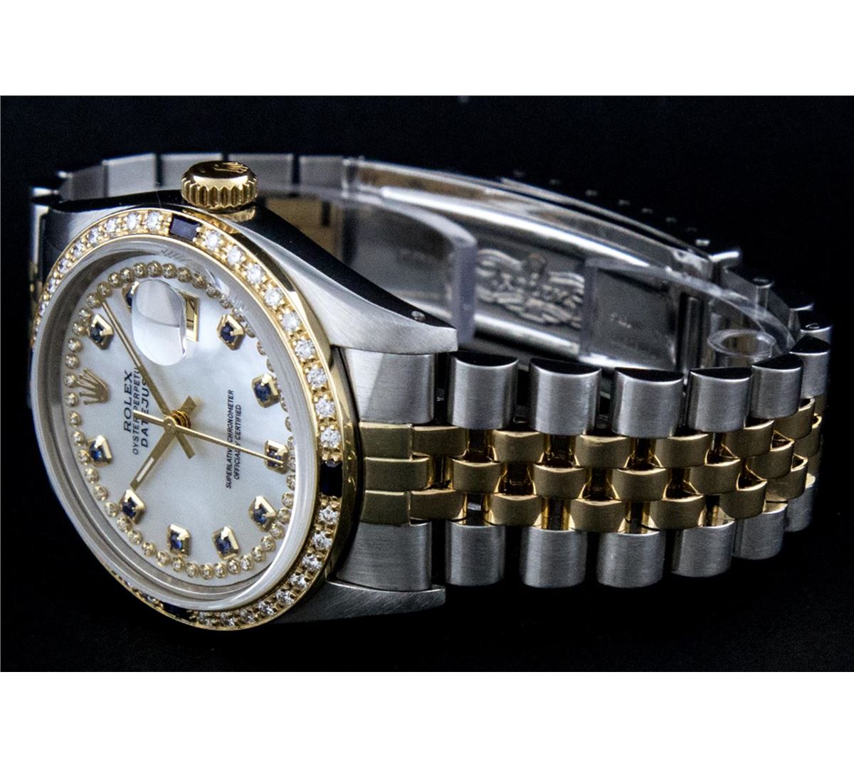 One Mens Two Tone Rolex Datejust Polished, Serviced & Electronically Tested, 14K Yellow Gold & Stainless Steel Case:36mm, 14K Yellow Gold Crown, Custom Bezel: 18K Yellow Gold Sapphire Beadset Diamond Bezel, Diamond Count: 36 Diamonds + 4 Sapphires Total Weight 1.00 Carat, Clarity: Si-VS, Color: G to H. Custom Crystal: Synthetic Sapphire Cyclops Lens. Movement: Automatic Winding Movement Caliber 3035. Custom Dial: Mother Of Pearl Sapphire String Diamond Dial , Diamond + Gem Count: 10 Sapphires + 48 Diamonds in Dial G To H In Color, SI-VS Clarity. Date Window: 3 O'Clock Position Date Display, Quickset, Model: 16013 Condition: G-6 Extra Fine. Bracelet: Two Tone 14K Yellow Gold & Stainless Steel Jubilee. Bright Polish. 7.0 Inch Length, Adjustable. Standard Clasp, With Rolex Logo.