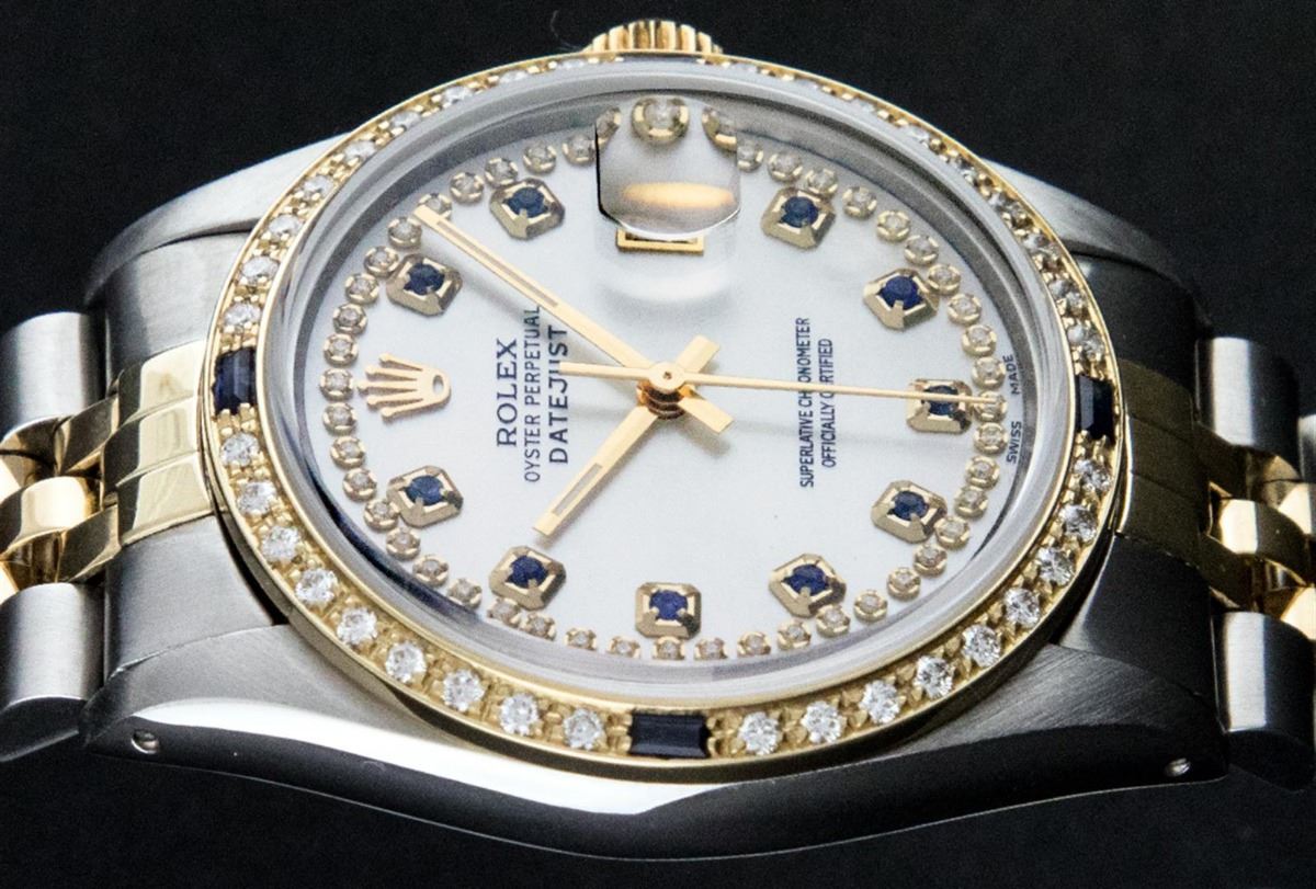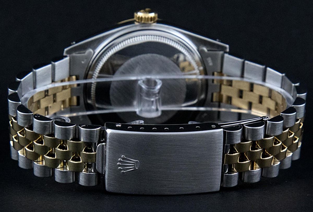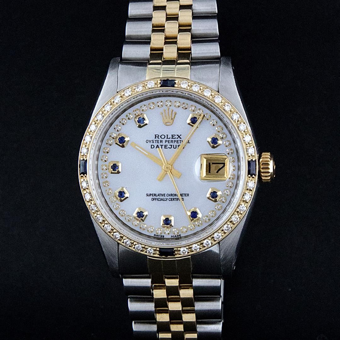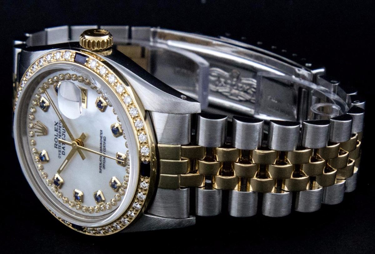 One Mens Two Tone Rolex Datejust Polished, Serviced & Electronically Tested, 14K Yellow Gold & Stainless Steel Case:36mm, 14K Yellow Gold Crown, Custom Bezel: 18K Yellow Gold Sapphire Beadset Diamond Bezel, Diamond Count: 36 Diamonds + 4 Sapphires Total Weight 1.00 Carat, Clarity: Si-VS, Color: G to H. Custom Crystal: Synthetic Sapphire Cyclops Lens. Movement: Automatic Winding Movement Caliber 3035. Custom Dial: Mother Of Pearl Sapphire String Diamond Dial , Diamond + Gem Count: 10 Sapphires + 48 Diamonds in Dial G To H In Color, SI-VS Clarity. Date Window: 3 O'Clock Position Date Display, Quickset, Model: 16013 Condition: G-6 Extra Fine. Bracelet: Two Tone 14K Yellow Gold & Stainless Steel Jubilee. Bright Polish. 7.0 Inch Length, Adjustable. Standard Clasp, With Rolex Logo.