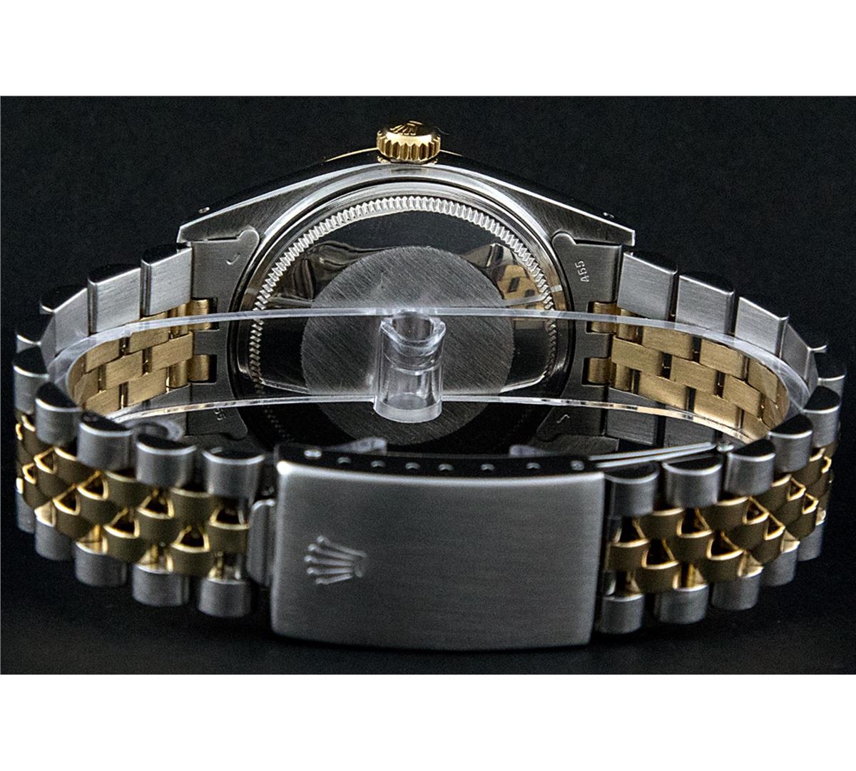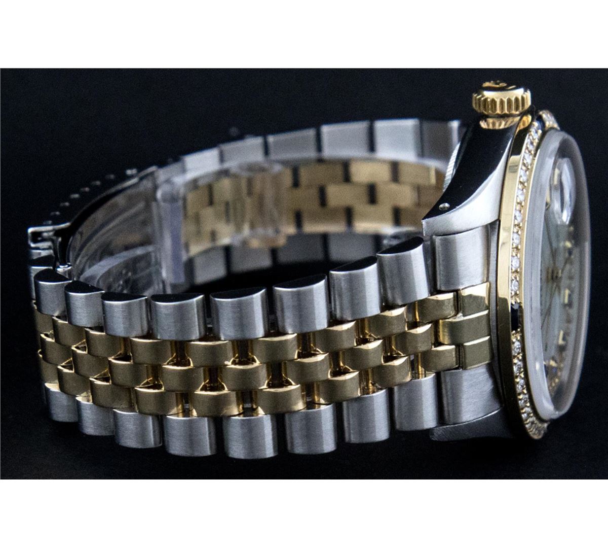 One Mens Two Tone Rolex Datejust Polished, Serviced & Electronically Tested, 14K Yellow Gold & Stainless Steel Case:36mm, 14K Yellow Gold Crown, Custom Bezel: 18K Yellow Gold Sapphire Beadset Diamond Bezel, Diamond Count: 36 Diamonds + 4 Sapphires Total Weight 1.00 Carat, Clarity: Si-VS, Color: G to H. Custom Crystal: Synthetic Sapphire Cyclops Lens. Movement: Automatic Winding Movement Caliber 3035. Custom Dial: Mother Of Pearl Sapphire String Diamond Dial , Diamond + Gem Count: 10 Sapphires + 48 Diamonds in Dial G To H In Color, SI-VS Clarity. Date Window: 3 O'Clock Position Date Display, Quickset, Model: 16013 Condition: G-6 Extra Fine. Bracelet: Two Tone 14K Yellow Gold & Stainless Steel Jubilee. Bright Polish. 7.0 Inch Length, Adjustable. Standard Clasp, With Rolex Logo.