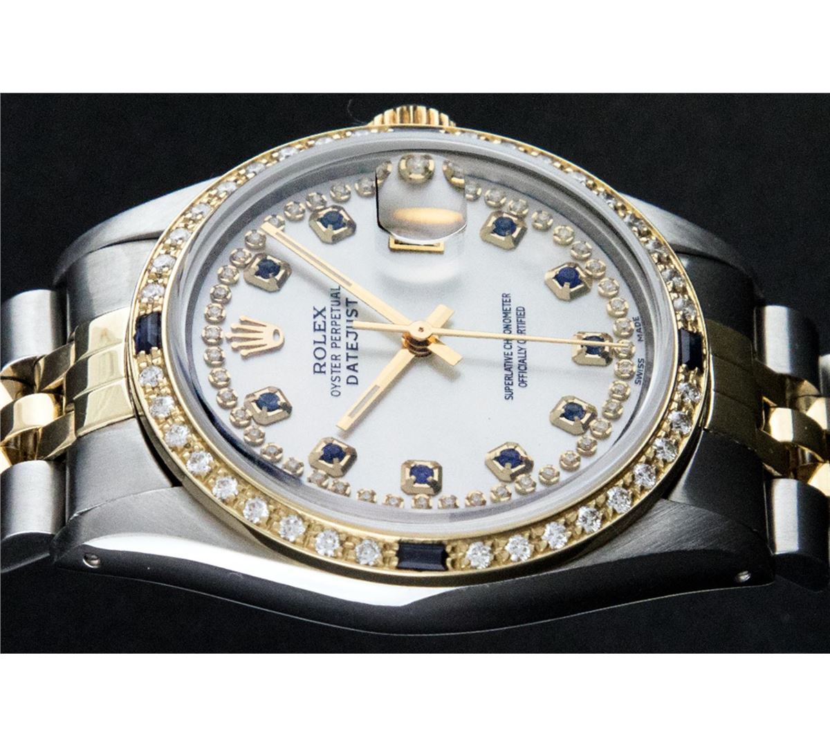 One Mens Two Tone Rolex Datejust Polished, Serviced & Electronically Tested, 14K Yellow Gold & Stainless Steel Case:36mm, 14K Yellow Gold Crown, Custom Bezel: 18K Yellow Gold Sapphire Beadset Diamond Bezel, Diamond Count: 36 Diamonds + 4 Sapphires Total Weight 1.00 Carat, Clarity: Si-VS, Color: G to H. Custom Crystal: Synthetic Sapphire Cyclops Lens. Movement: Automatic Winding Movement Caliber 3035. Custom Dial: Mother Of Pearl Sapphire String Diamond Dial , Diamond + Gem Count: 10 Sapphires + 48 Diamonds in Dial G To H In Color, SI-VS Clarity. Date Window: 3 O'Clock Position Date Display, Quickset, Model: 16013 Condition: G-6 Extra Fine. Bracelet: Two Tone 14K Yellow Gold & Stainless Steel Jubilee. Bright Polish. 7.0 Inch Length, Adjustable. Standard Clasp, With Rolex Logo.