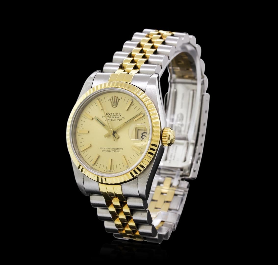 One, hand crafted & machine milled Rolex two-tone Mid-Size DateJust wristwatch electronically tested, Stainless Steel Case: 30mm oyster, 18KT yellow gold Crown: twinlock with logo, 18KT yellow gold Bezel: fluted, Crystal: synthetic sapphire cyclops lens. Movement: superlative chronometer, Dial: Champagne, with baton hands and indices, Date Window: quick set, Circa: 1983, Bracelet: two-tone stainless steel & 18KT yellow gold jubilee, Condition: G-6 Extra Fine. Six inch length, adjustable. Total Weight of Watch 69.92gm. AIG Appraised at $7,050.00.