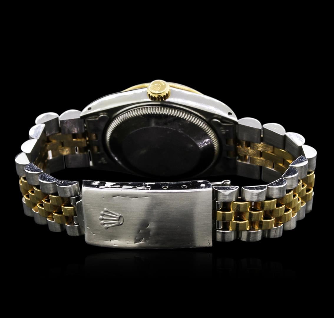 One, hand crafted & machine milled Rolex two-tone Mid-Size DateJust wristwatch electronically tested, Stainless Steel Case: 30mm oyster, 18KT yellow gold Crown: twinlock with logo, 18KT yellow gold Bezel: fluted, Crystal: synthetic sapphire cyclops lens. Movement: superlative chronometer, Dial: Champagne, with baton hands and indices, Date Window: quick set, Circa: 1983, Bracelet: two-tone stainless steel & 18KT yellow gold jubilee, Condition: G-6 Extra Fine. Six inch length, adjustable. Total Weight of Watch 69.92gm. AIG Appraised at $7,050.00.