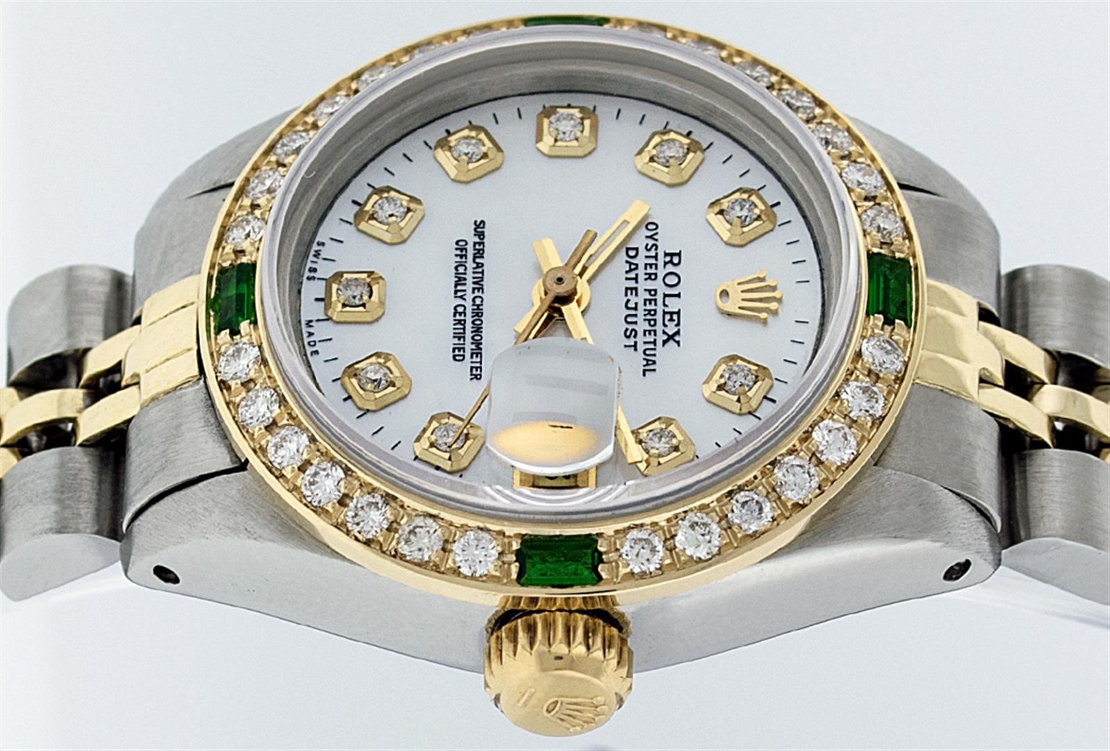 One Ladies Two Tone Rolex Datejust Polished, Serviced & Electronically Tested, 14K Yellow Gold & Stainless Steel Case:26mm, 14K Yellow Gold Crown, Custom Bezel: 18K Yellow Gold Emerald Beadset Diamond Bezel, Stone Count: 28 Diamonds + 4 Emeralds, Total Weight .70 Carat, Clarity: Si-VS, Color: G to H. Custom Crystal: Synthetic Sapphire Cyclops Lens. Movement: Automatic Winding Movement Caliber 2030. Custom Dial: Mother Of Pearl Diamond Dial With Small Tracks, Stone Count: 10 Diamonds in Dial. Date Window: 3 O'Clock Position Date Display, Model: Datejust, Condition: G-6 Extra Fine. Bracelet: Two Tone 14K Yellow Gold & Stainless Steel Jubilee. Bright Polish. 5.5 Inch Length, Adjustable. Standard Clasp, With Rolex Logo. Comes with a 6 month warranty card.