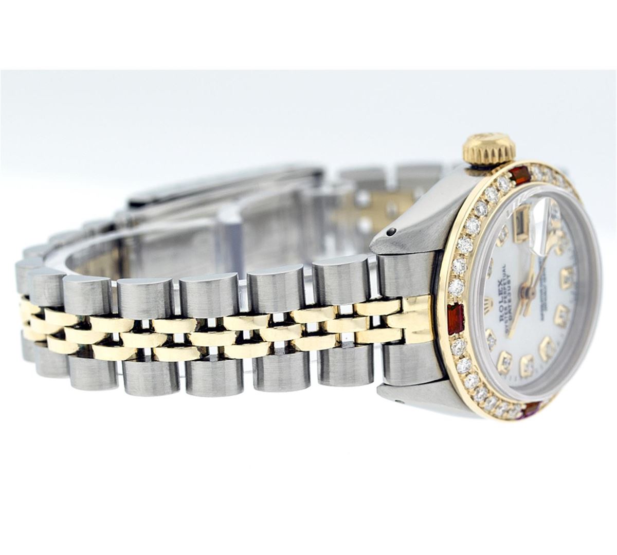 One Ladies Two Tone Rolex Datejust Polished, Serviced & Electronically Tested, 14K Yellow Gold & Stainless Steel Case:26mm, 14K Yellow Gold Crown, Custom Bezel: 18K Yellow Gold Ruby Beadset Diamond Bezel, Stone Count: 28 Diamonds + 4 Rubies, Total Weight .70 Carat, Clarity: Si-VS, Color: G to H. Custom Crystal: Synthetic Sapphire Cyclops Lens. Movement: Automatic Winding Movement Caliber 2030. Custom Dial: Mother Of Pearl Diamond Dial With Small Tracks, Stone Count: 10 Diamonds in Dial. Date Window: 3 O'Clock Position Date Display, Model: Datejust, Condition: G-6 Extra Fine. Bracelet: Two Tone 14K Yellow Gold & Stainless Steel Jubilee. Bright Polish. 5.5 Inch Length, Adjustable. Standard Clasp, With Rolex Logo. Comes with a 6 month warranty card.