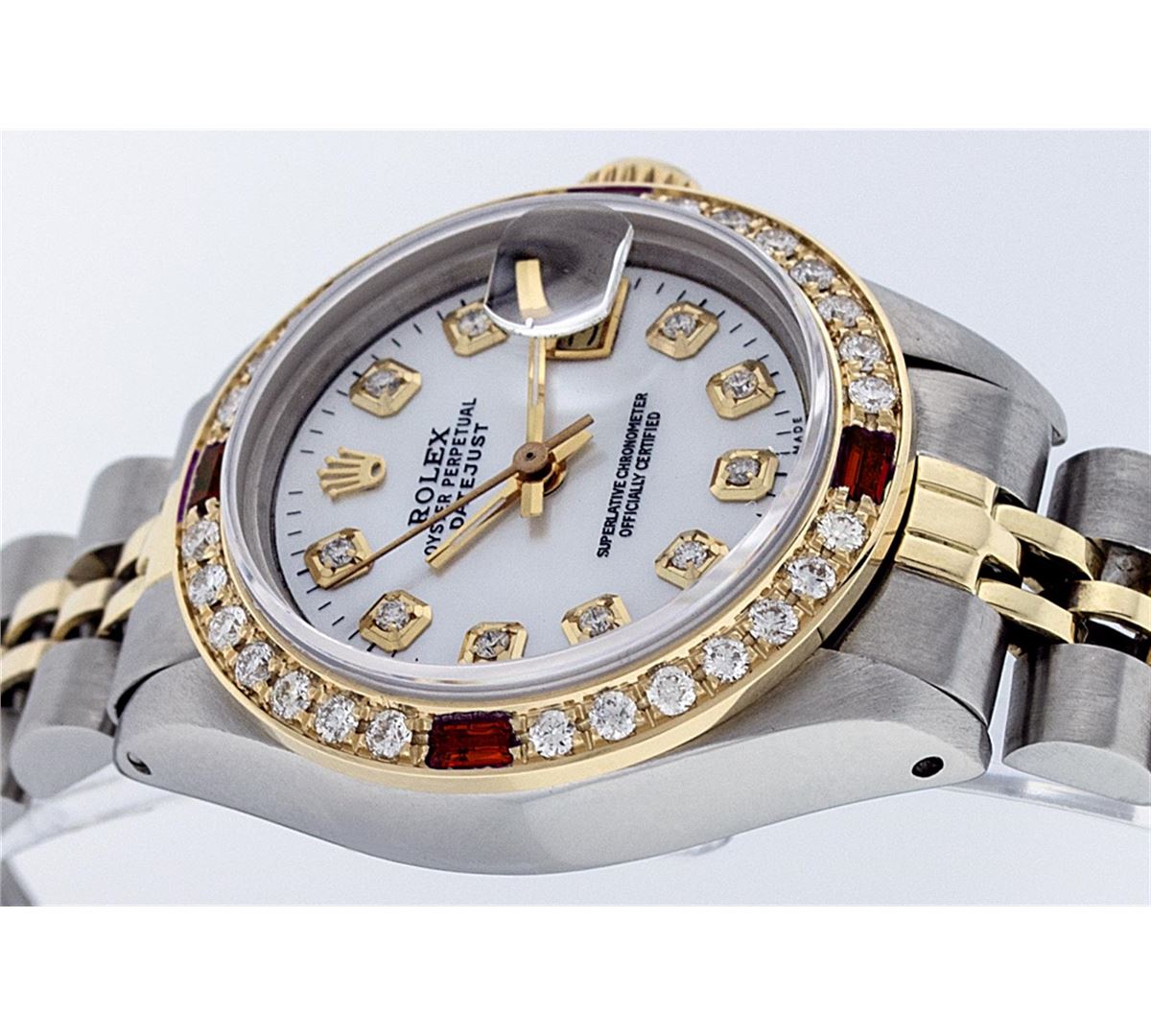 One Ladies Two Tone Rolex Datejust Polished, Serviced & Electronically Tested, 14K Yellow Gold & Stainless Steel Case:26mm, 14K Yellow Gold Crown, Custom Bezel: 18K Yellow Gold Ruby Beadset Diamond Bezel, Stone Count: 28 Diamonds + 4 Rubies, Total Weight .70 Carat, Clarity: Si-VS, Color: G to H. Custom Crystal: Synthetic Sapphire Cyclops Lens. Movement: Automatic Winding Movement Caliber 2030. Custom Dial: Mother Of Pearl Diamond Dial With Small Tracks, Stone Count: 10 Diamonds in Dial. Date Window: 3 O'Clock Position Date Display, Model: Datejust, Condition: G-6 Extra Fine. Bracelet: Two Tone 14K Yellow Gold & Stainless Steel Jubilee. Bright Polish. 5.5 Inch Length, Adjustable. Standard Clasp, With Rolex Logo. Comes with a 6 month warranty card.