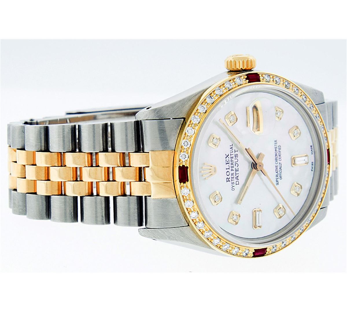 One Mens Two Tone Rolex Datejust Polished, Serviced & Electronically Tested, 14K Yellow Gold & Stainless Steel Case:36mm, 14K Yellow Gold Crown, Custom Bezel: 18K Yellow Gold Ruby Beadset Diamond Bezel, Diamond + Gem Count: 38 Diamonds + 4 Rubies Total Weight 1.00 Carat, Clarity: Si-VS, Color: G to H. Custom Crystal: Synthetic Sapphire Cyclops Lens. Movement: Automatic Winding Movement Caliber 3035. Custom Dial: Mother Of Pearl Diamond With Baguette, 8 Diamonds + 2 Baguettes in Dial, Dial Weight: .40 Carat G To H In Color, Clarity: SI-VS Date Window: 3 O'Clock Position Date Display, Quickset, Model: 16013 Condition: G-6 Extra Fine. Bracelet: Two Tone 14K Yellow Gold & Stainless Steel Jubilee. Bright Polish. 7.0 Inch Length, Adjustable. Standard Clasp, With Rolex Logo. Comes with a 6 month warranty card.