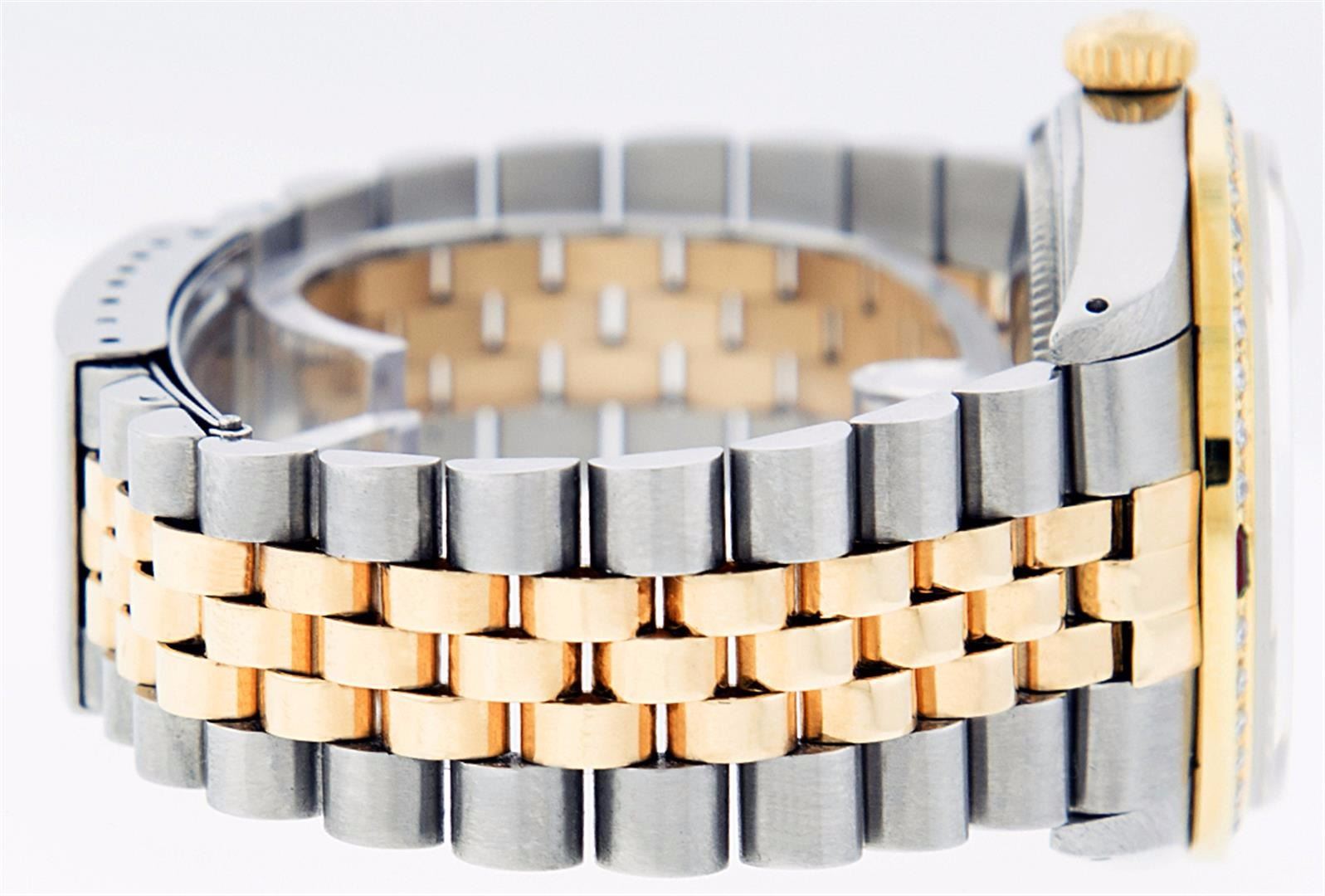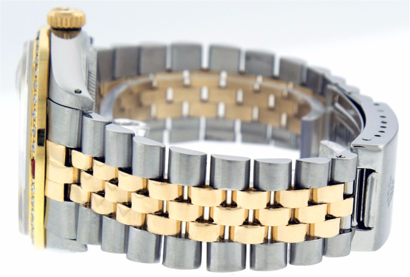 One Mens Two Tone Rolex Datejust Polished, Serviced & Electronically Tested, 14K Yellow Gold & Stainless Steel Case:36mm, 14K Yellow Gold Crown, Custom Bezel: 18K Yellow Gold Ruby Beadset Diamond Bezel, Diamond + Gem Count: 38 Diamonds + 4 Rubies Total Weight 1.00 Carat, Clarity: Si-VS, Color: G to H. Custom Crystal: Synthetic Sapphire Cyclops Lens. Movement: Automatic Winding Movement Caliber 3035. Custom Dial: Mother Of Pearl Diamond With Baguette, 8 Diamonds + 2 Baguettes in Dial, Dial Weight: .40 Carat G To H In Color, Clarity: SI-VS Date Window: 3 O'Clock Position Date Display, Quickset, Model: 16013 Condition: G-6 Extra Fine. Bracelet: Two Tone 14K Yellow Gold & Stainless Steel Jubilee. Bright Polish. 7.0 Inch Length, Adjustable. Standard Clasp, With Rolex Logo. Comes with a 6 month warranty card.