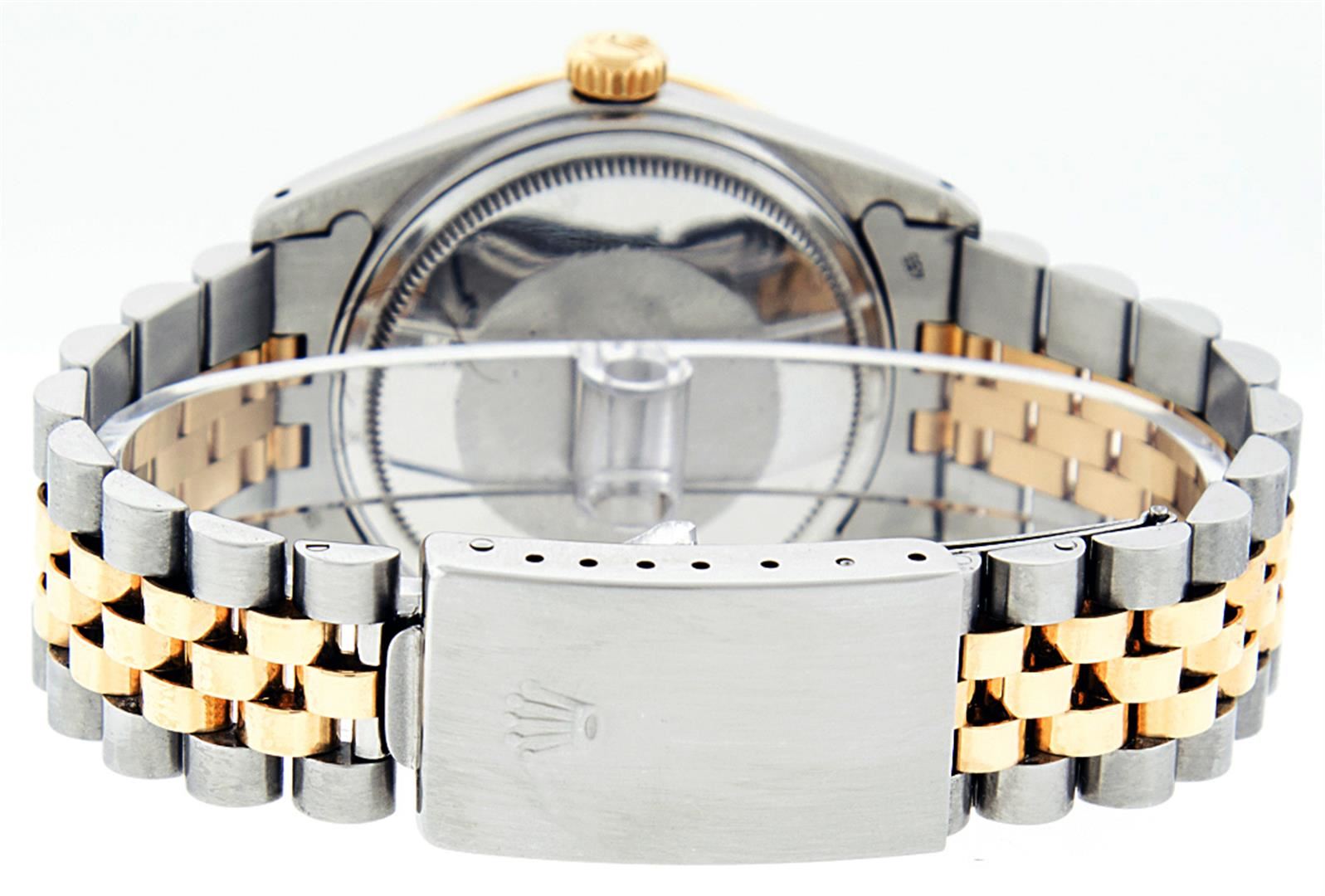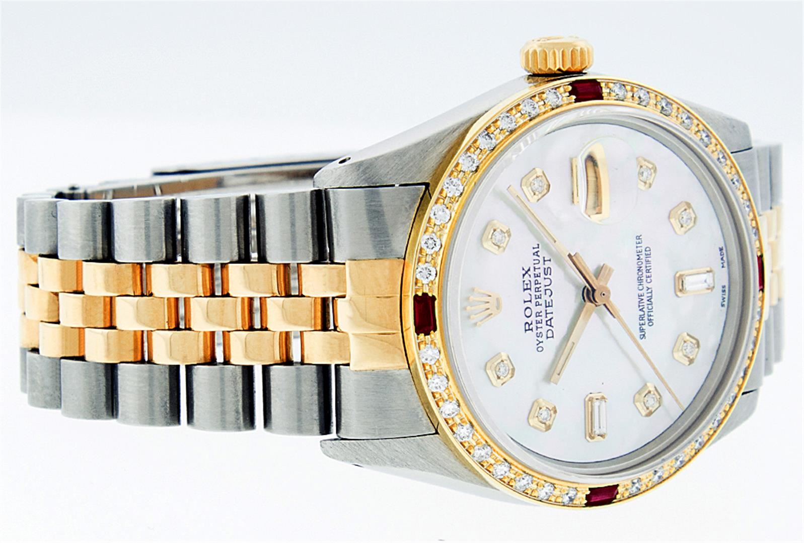 One Mens Two Tone Rolex Datejust Polished, Serviced & Electronically Tested, 14K Yellow Gold & Stainless Steel Case:36mm, 14K Yellow Gold Crown, Custom Bezel: 18K Yellow Gold Ruby Beadset Diamond Bezel, Diamond + Gem Count: 38 Diamonds + 4 Rubies Total Weight 1.00 Carat, Clarity: Si-VS, Color: G to H. Custom Crystal: Synthetic Sapphire Cyclops Lens. Movement: Automatic Winding Movement Caliber 3035. Custom Dial: Mother Of Pearl Diamond With Baguette, 8 Diamonds + 2 Baguettes in Dial, Dial Weight: .40 Carat G To H In Color, Clarity: SI-VS Date Window: 3 O'Clock Position Date Display, Quickset, Model: 16013 Condition: G-6 Extra Fine. Bracelet: Two Tone 14K Yellow Gold & Stainless Steel Jubilee. Bright Polish. 7.0 Inch Length, Adjustable. Standard Clasp, With Rolex Logo. Comes with a 6 month warranty card.