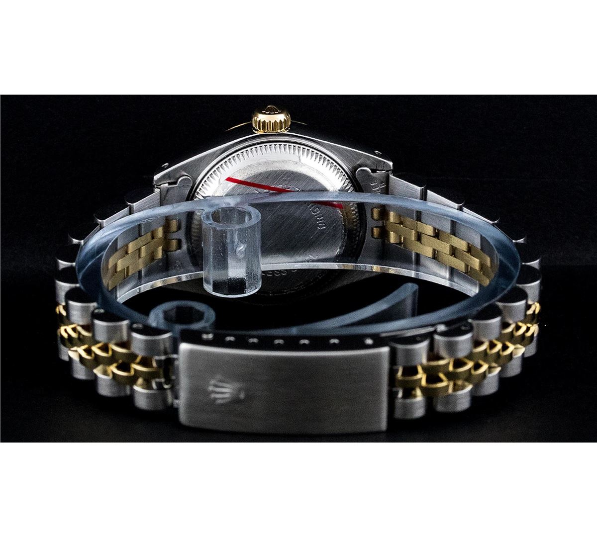 One Ladies Two Tone Rolex Datejust Polished, Serviced & Electronically Tested, 14K Yellow Gold & Stainless Steel Case:26mm, 14K Yellow Gold Crown, Bezel: 14K Yellow Gold Fluted Bezel. Custom Crystal: Acrylic Cyclops Lens. Movement: Automatic Winding Movement Caliber 2030. Custom Dial: Mother Of Pearl Roman With Square Track. Date Window: 3 O'Clock Position Date Display, Model: Datejust. Condition: G-6 Extra Fine. Bracelet: Two Tone 14K Yellow Gold & Stainless Steel Jubilee Band. Bright Polish. 5.5 Inch Length, Adjustable. Standard Clasp, With Rolex Logo. Comes with a 6 month warranty card.