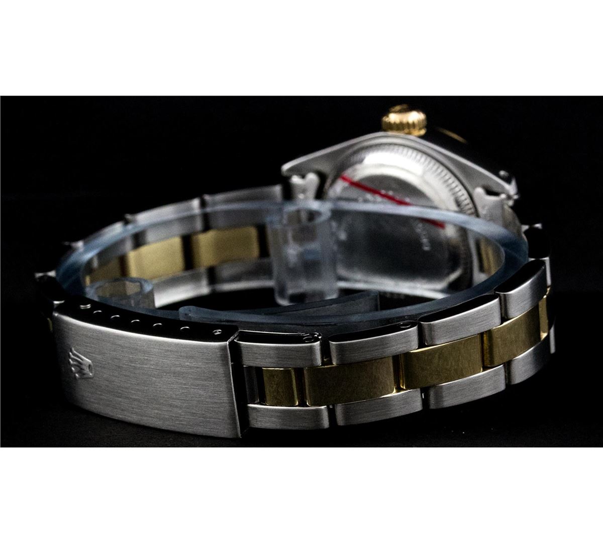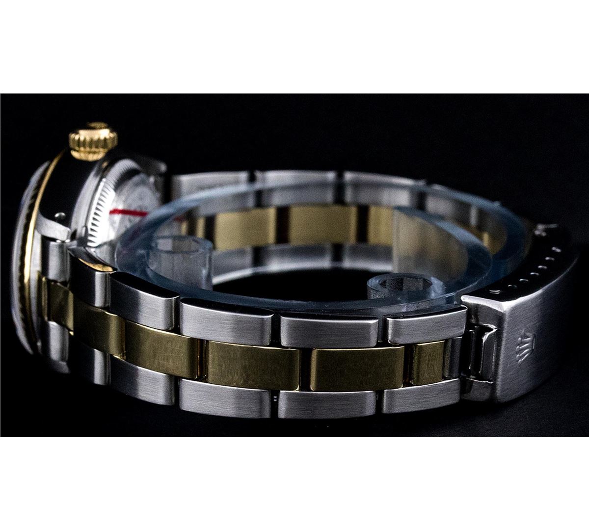 One Ladies Two Tone Rolex Datejust Polished, Serviced & Electronically Tested, 14K Yellow Gold & Stainless Steel Case:26mm, 14K Yellow Gold Crown, Bezel: 14K Yellow Gold Fluted Bezel. Custom Crystal: Acrylic Cyclops Lens. Movement: Automatic Winding Movement Caliber 2030. Custom Dial: Mother Of Pearl Roman With Square Track. Date Window: 3 O'Clock Position Date Display, Model: Datejust. Condition: G-6 Extra Fine. Bracelet: Two Tone 14K Yellow Gold & Stainless Steel Oyster Band. Bright Polish. 5.5 Inch Length, Adjustable. Standard Clasp, With Rolex Logo. Comes with a 6 month warranty card.