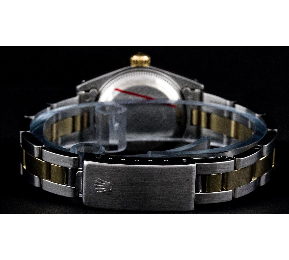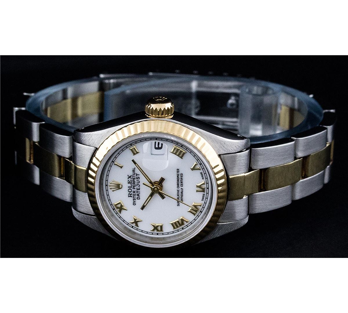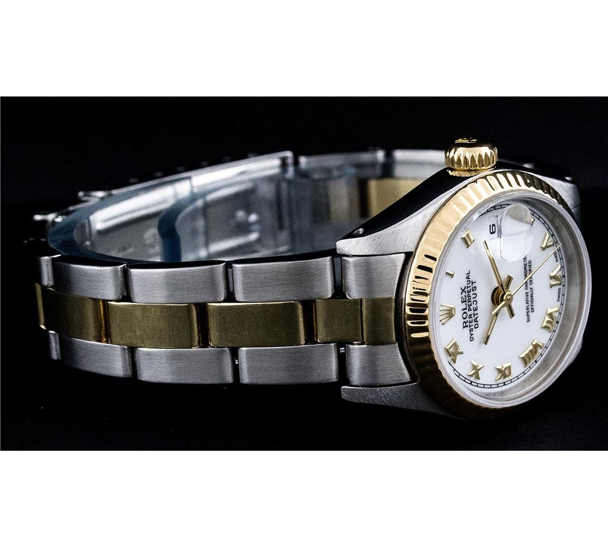 One Ladies Two Tone Rolex Datejust Polished, Serviced & Electronically Tested, 14K Yellow Gold & Stainless Steel Case:26mm, 14K Yellow Gold Crown, Bezel: 14K Yellow Gold Fluted Bezel. Custom Crystal: Acrylic Cyclops Lens. Movement: Automatic Winding Movement Caliber 2030. Custom Dial: Mother Of Pearl Roman With Square Track. Date Window: 3 O'Clock Position Date Display, Model: Datejust. Condition: G-6 Extra Fine. Bracelet: Two Tone 14K Yellow Gold & Stainless Steel Oyster Band. Bright Polish. 5.5 Inch Length, Adjustable. Standard Clasp, With Rolex Logo. Comes with a 6 month warranty card.