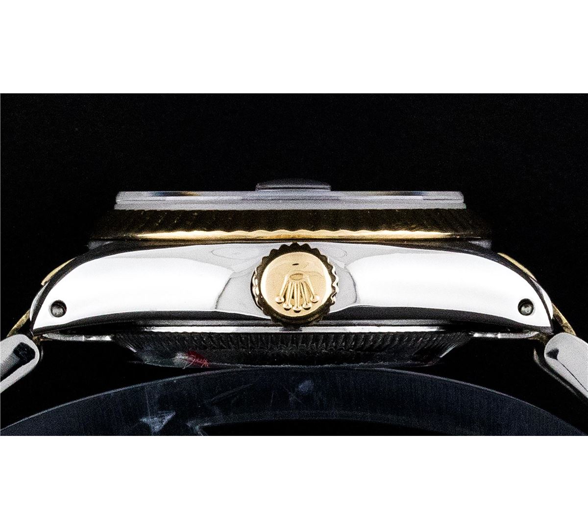 One Ladies Two Tone Rolex Datejust Polished, Serviced & Electronically Tested, 14K Yellow Gold & Stainless Steel Case:26mm, 14K Yellow Gold Crown, Bezel: 14K Yellow Gold Fluted Bezel. Custom Crystal: Acrylic Cyclops Lens. Movement: Automatic Winding Movement Caliber 2030. Custom Dial: Mother Of Pearl Roman With Square Track. Date Window: 3 O'Clock Position Date Display, Model: Datejust. Condition: G-6 Extra Fine. Bracelet: Two Tone 14K Yellow Gold & Stainless Steel Oyster Band. Bright Polish. 5.5 Inch Length, Adjustable. Standard Clasp, With Rolex Logo. Comes with a 6 month warranty card.
