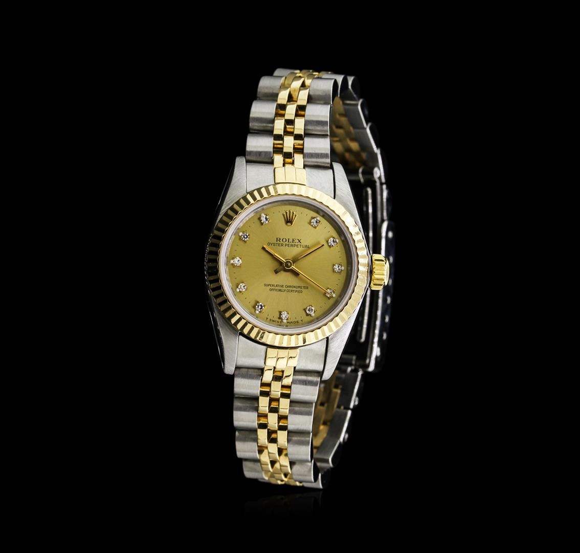 One ladies, hand crafted & machine milled Rolex Oyster Perpetual Model wristwatch electronically tested, Stainless Steel Case: 25mm oyster, 18KT Yellow gold Crown: twinlock with logo, 18KT Yellow gold Bezel: fluted, Crystal: synthetic sapphire lens. Swiss Automatic Movement: superlative chronometer, Dial: Champagne with baton hands, diamond markers, and a bordering minute track, Circa: 1994, Condition: G-6 Extra Fine. Bracelet: stainless steel and 18KT yellow gold jubilee. Six inch length, adjustable. Standard clasp, with logo. Total Weight of Watch 48.66gm. AIG Appraised at $6,880.00.