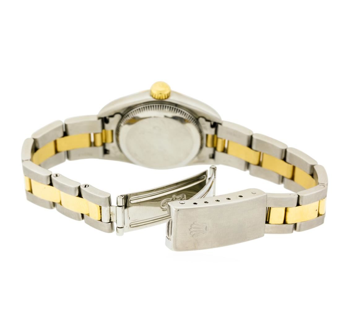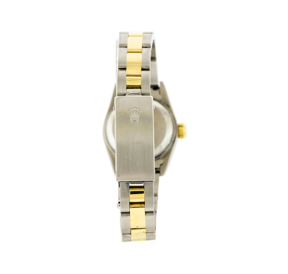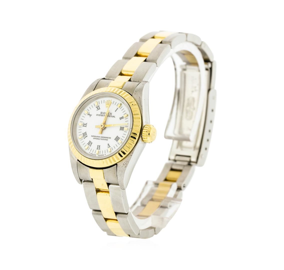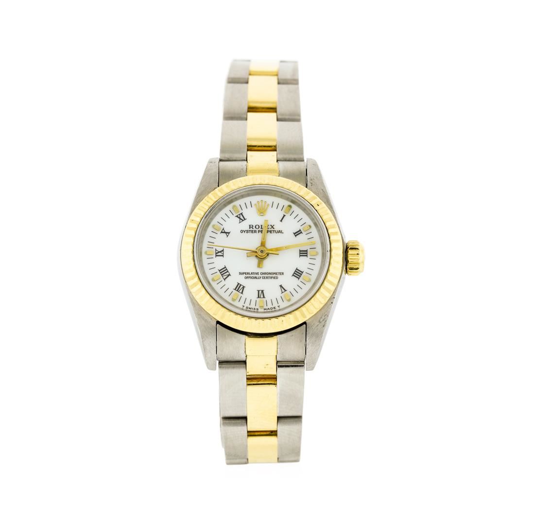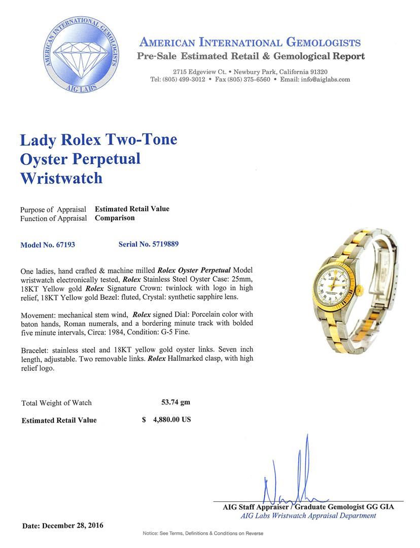 One ladies, hand crafted & machine milled Rolex Oyster Perpetual Model wristwatch electronically tested, Rolex Stainless Steel Oyster Case: 25mm, 18KT Yellow gold Rolex Signature Crown: twinlock with logo in high relief, 18KT Yellow gold Bezel: fluted, Crystal: synthetic sapphire lens. Movement: mechanical stem wind, Rolex signed Dial: Porcelain color with baton hands, Roman numerals, and a bordering minute track with bolded five minute intervals, Circa: 1984, Condition: G-5 Fine. Bracelet: stainless steel and 18KT yellow gold oyster links. Seven inch length, adjustable. Two removable links. Rolex Hallmarked clasp, with high relief logo. Total Weight of Watch 53.74gm. AIG Appraised at $4,880.00.