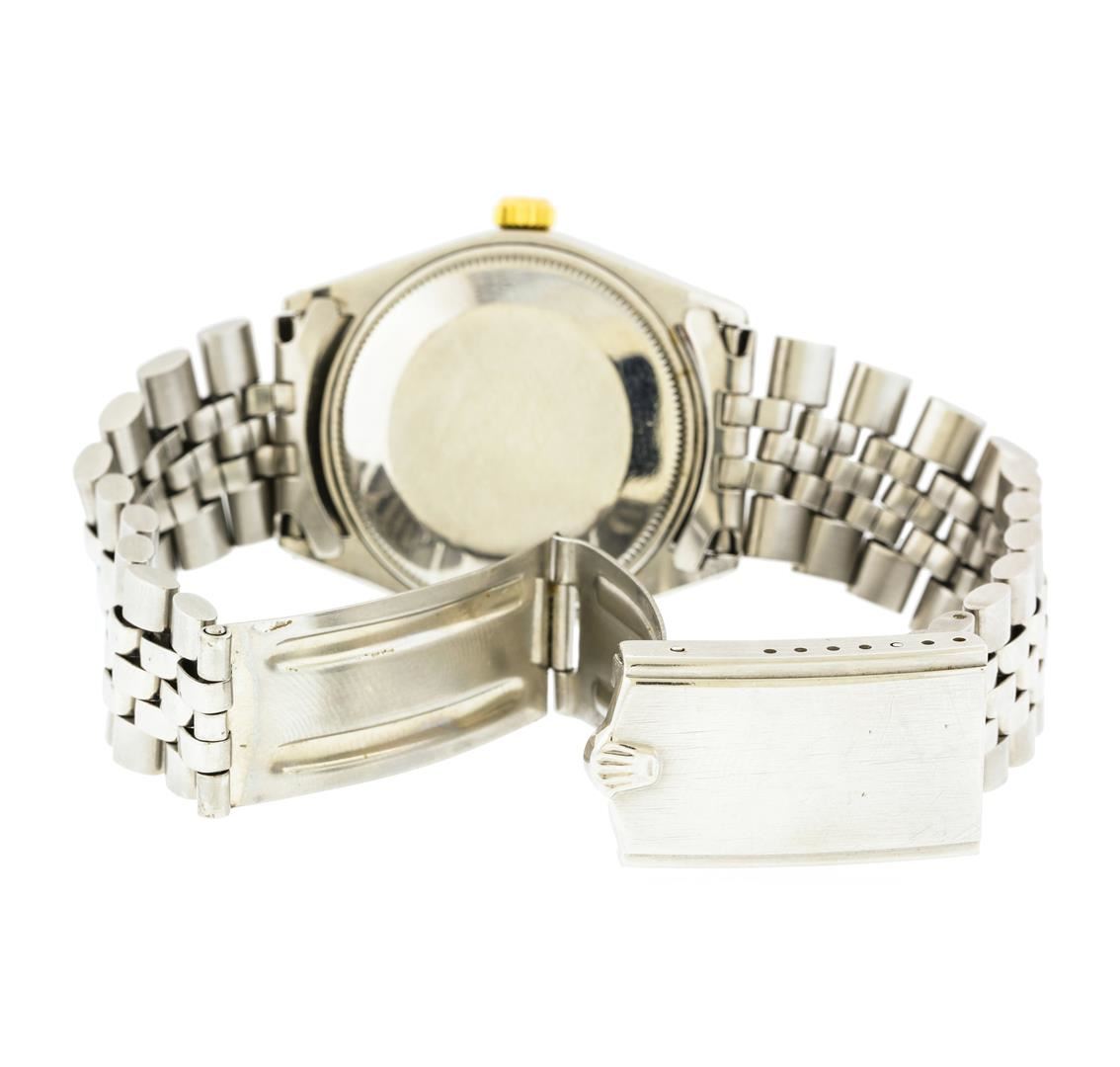 One, gents, hand crafted & machine milled Rolex Oyster Perpetual wristwatch electronically tested Stainless Steel, Case: 35mm oyster, Crown: 14KT yellow gold twinlock, with Rolex logo in high relief, Bezel: 14KT yellow gold with a high polish finish, Crystal: acrylic lens, Circa 1964.Movement: mechanical stem wind, certified chronometer, Rolex signed Dial: Light Ivory color, with pointed hands and raised indices, Rolex Bracelet: Stainless Steel jubilee links, Condition: G-4 Average. Seven inch adjustable length. Rolex USA clasp, with high relief logo. The logo and markings on the bracelet clasp are Rolex stampings. In the past, Rolex has produced parts including clasps in locations other than Switzerland. That is why there is a variation to the look; feel, and weight of Rolex parts that were made in different areas of the world. Today, however all parts are produced in Switzerland. The stamping in the clasp of the watch in this appraisal was created for the Rolex market in the U.S.A. during the 1960's. Total Weight of Watch 80.82gm. AIG Appraised at $4,880.00.
