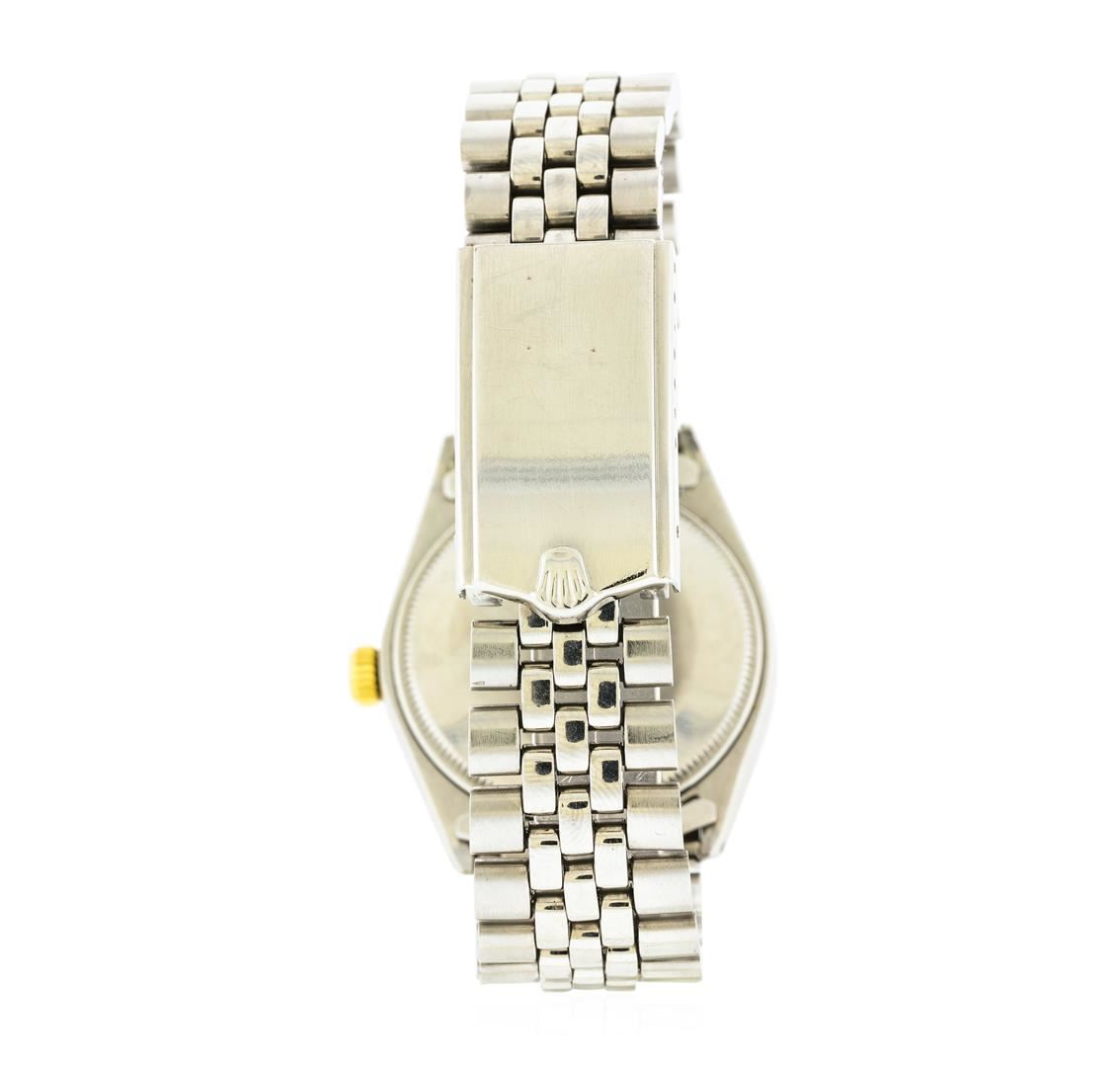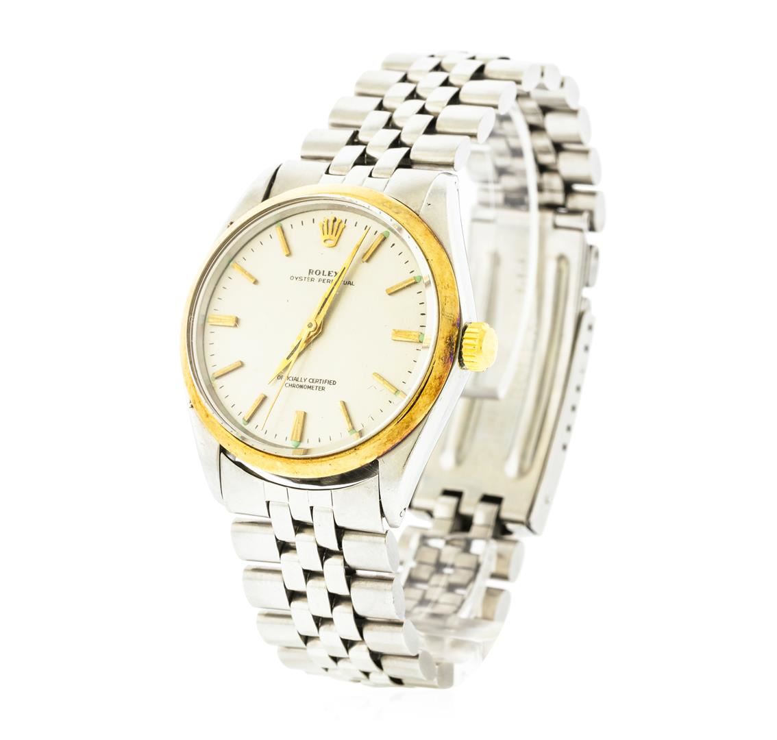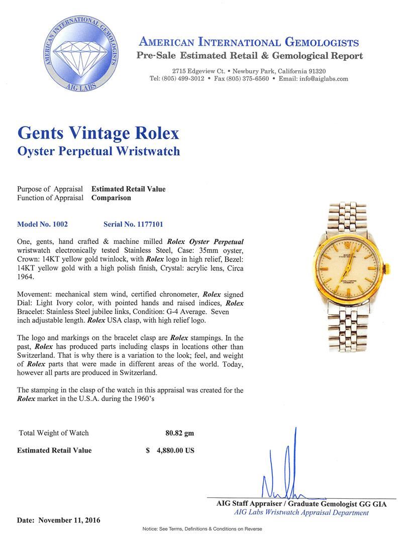 One, gents, hand crafted & machine milled Rolex Oyster Perpetual wristwatch electronically tested Stainless Steel, Case: 35mm oyster, Crown: 14KT yellow gold twinlock, with Rolex logo in high relief, Bezel: 14KT yellow gold with a high polish finish, Crystal: acrylic lens, Circa 1964.Movement: mechanical stem wind, certified chronometer, Rolex signed Dial: Light Ivory color, with pointed hands and raised indices, Rolex Bracelet: Stainless Steel jubilee links, Condition: G-4 Average. Seven inch adjustable length. Rolex USA clasp, with high relief logo. The logo and markings on the bracelet clasp are Rolex stampings. In the past, Rolex has produced parts including clasps in locations other than Switzerland. That is why there is a variation to the look; feel, and weight of Rolex parts that were made in different areas of the world. Today, however all parts are produced in Switzerland. The stamping in the clasp of the watch in this appraisal was created for the Rolex market in the U.S.A. during the 1960's. Total Weight of Watch 80.82gm. AIG Appraised at $4,880.00.