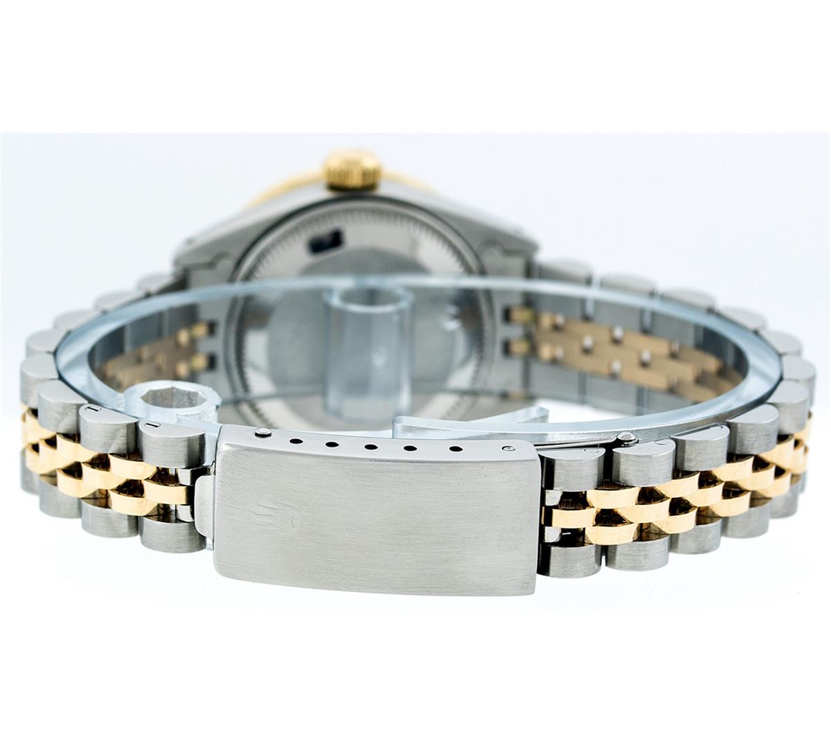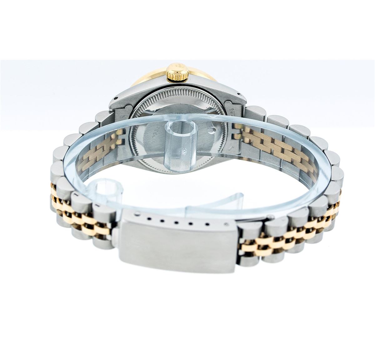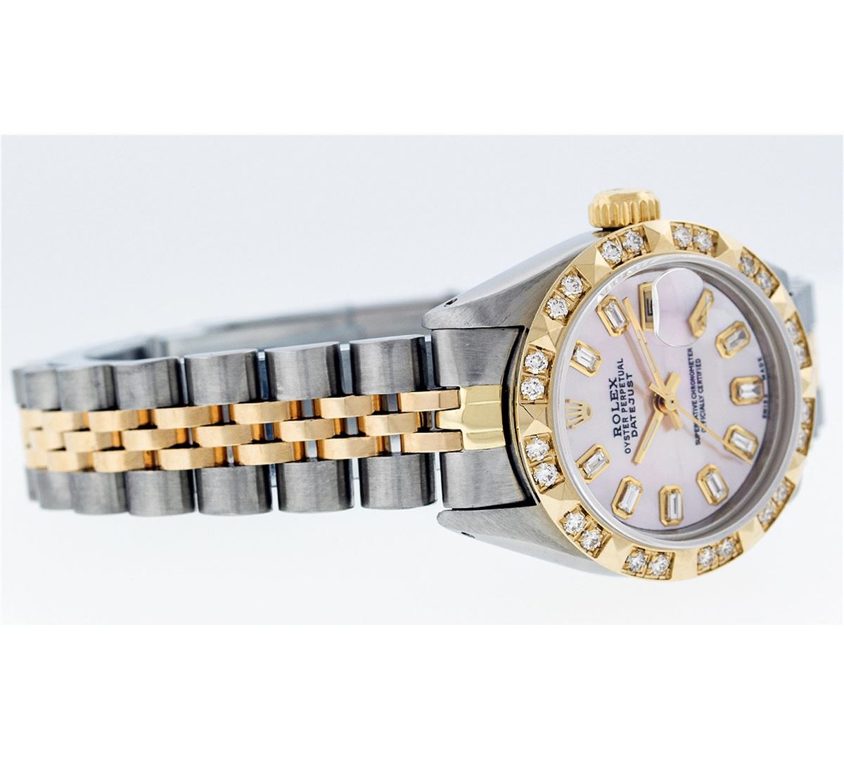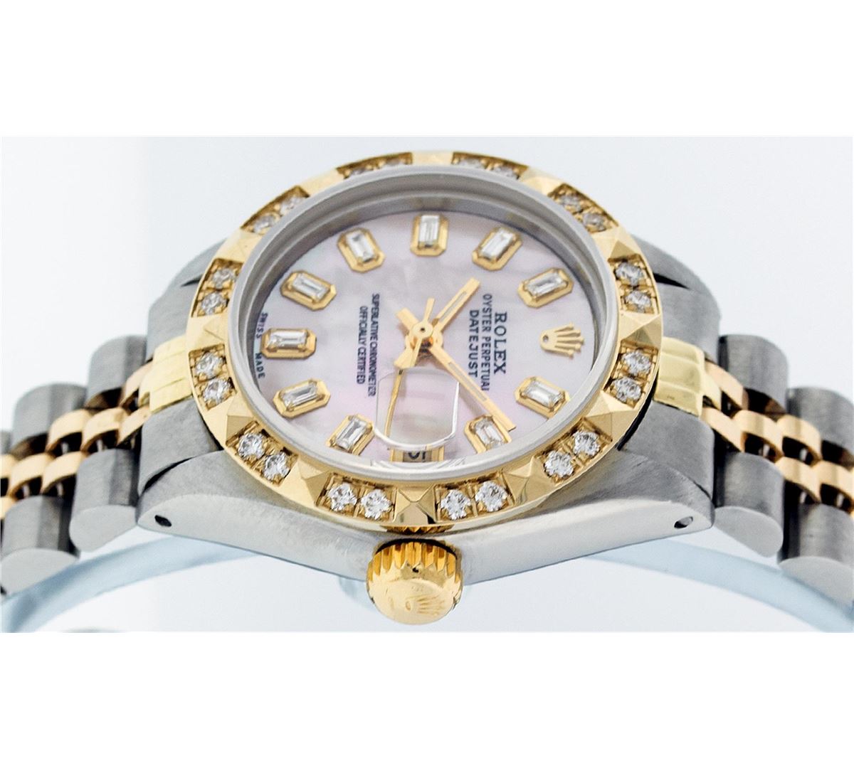 One Ladies Two Tone Rolex Datejust Polished, Serviced & Electronically Tested, 14K Yellow Gold & Stainless Steel Case:26mm, 14K Yellow Gold Crown, Custom Bezel: 18K Yellow Gold Pyramid Diamond Bezel, Diamond Count: 24 Diamonds Total Weight .70 Carat, Clarity: Si-VS, Color: G to H. Custom Crystal: Synthetic Sapphire Cyclops Lens. Movement: Automatic Winding Movement Caliber 2030. Custom Dial: Pink Mother Of Pearl Baguette Diamond Hour Markers. 10 Baguette Diamonds In Dial, Clarity: Si-VS, Color: G to H. Date Window: 3 O'Clock Position Date Display, Model: Datejust. Condition: G-6 Extra Fine. Bracelet: Two Tone 14K Yellow Gold & Stainless Steel Jubilee. Bright Polish. 5.5 Inch Length, Adjustable. Standard Clasp, With Rolex Logo. Comes with a 6 month warranty card.