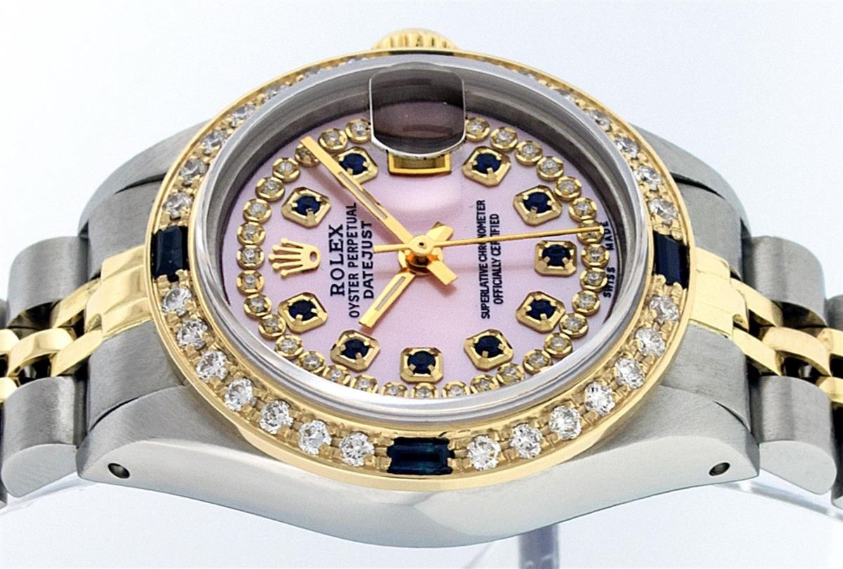 One Ladies Rolex Two Tone Rolex Datejust Polished, Serviced & Electronically Tested, 14K Yellow Gold & Stainless Steel Case:26mm, 14K Yellow Gold Crown, Custom Bezel: 18K Yellow Gold Sapphire Beadset Diamond Bezel, Diamond Count: 28 Diamonds + 4 Sapphires Total Weight .70 Carat, Clarity: Si-VS, Color: G to H. Custom Crystal: Synthetic Sapphire Cyclops Lens. Movement: Automatic Winding Movement Caliber 2030. Custom Dial: Pink Mother Of Pearl With Sapphire String Diamond Dial, Stone Count: 10 Sapphires + 33 Diamonds. Date Window: 3 O'Clock Position Date Display, Model: Datejust. Condition: G-6 Extra Fine. Bracelet: Two Tone 14K Yellow Gold & Stainless Steel Jubilee. Bright Polish. 6.0 Inch Length, Adjustable. Standard Clasp, With Rolex Logo. Comes with 6 month warranty.