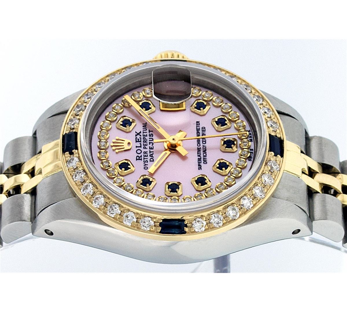 One Ladies Rolex Two Tone Rolex Datejust Polished, Serviced & Electronically Tested, 14K Yellow Gold & Stainless Steel Case:26mm, 14K Yellow Gold Crown, Custom Bezel: 18K Yellow Gold Sapphire Beadset Diamond Bezel, Diamond Count: 28 Diamonds + 4 Sapphires Total Weight .70 Carat, Clarity: Si-VS, Color: G to H. Custom Crystal: Synthetic Sapphire Cyclops Lens. Movement: Automatic Winding Movement Caliber 2030. Custom Dial: Pink Mother Of Pearl With Sapphire String Diamond Dial, Stone Count: 10 Sapphires + 33 Diamonds. Date Window: 3 O'Clock Position Date Display, Model: Datejust. Condition: G-6 Extra Fine. Bracelet: Two Tone 14K Yellow Gold & Stainless Steel Jubilee. Bright Polish. 6.0 Inch Length, Adjustable. Standard Clasp, With Rolex Logo. Comes with 6 month warranty.